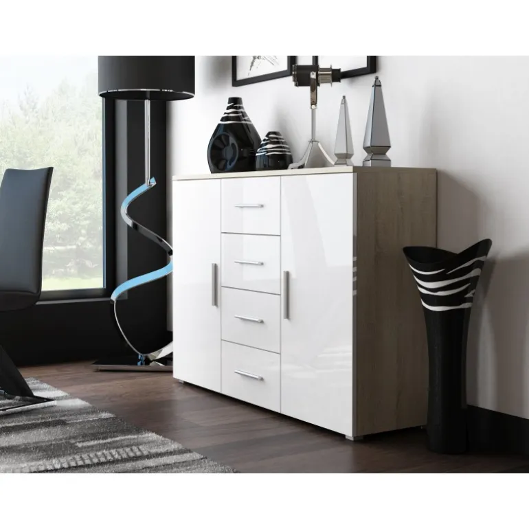Kommode UNI Sonoma Eg/Hvid er den perfekte løsning til at tilføje stil og funktionalitet til dit hjem. Med dimensionerne højde: 92 cm, bredde: 132 cm, dybde: 38 cm passer denne rummelige kommode ind i enhver stue, soveværelse eller entré. Lavet af holdbart lamineret mat spånplade til kroppen og lamineret højglans MDF til fronten, sikrer denne kommode langvarig holdbarhed og et moderne look. De stilfulde plastikgreb tilføjer et elegant touch til designet. Få orden på dine ejendele med kommode UNI Sonoma Eg/Hvid og nyd en ryddelig og æstetisk tiltalende indretning.