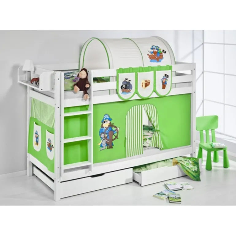 Har du brug for plads til to og ønsker den komplette løsning? Men dette sæt fra serien Bumle kan dine børn trygt lege, sove og drømme. Sengen kommer inkl. forhæng med grønt pirat tema, 2 bundskuffer samt madrasser og lamelbunde. Sengen er udstyret med flytbar stige med gode brede trin, som kan monteres i enten højre eller venstre side. Bumle er serien til dig som går op i kvalitet og tidløst design men ikke vil betale for dyre mærkevarer.