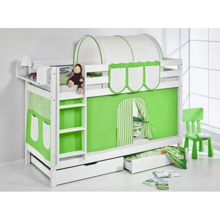Har du brug for plads til to og ønsker den komplette løsning? Men dette sæt fra serien Bumle kan dine børn trygt lege, sove og drømme. Sengen kommer inkl. forhæng med grønt og beige tema, 2 bundskuffer samt madrasser og lamelbunde. Sengen er udstyret med flytbar stige med gode brede trin, som kan monteres i enten højre eller venstre side. Bumle er serien til dig som går op i kvalitet og tidløst design men ikke vil betale for dyre mærkevarer.