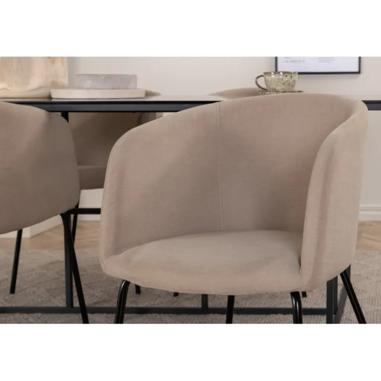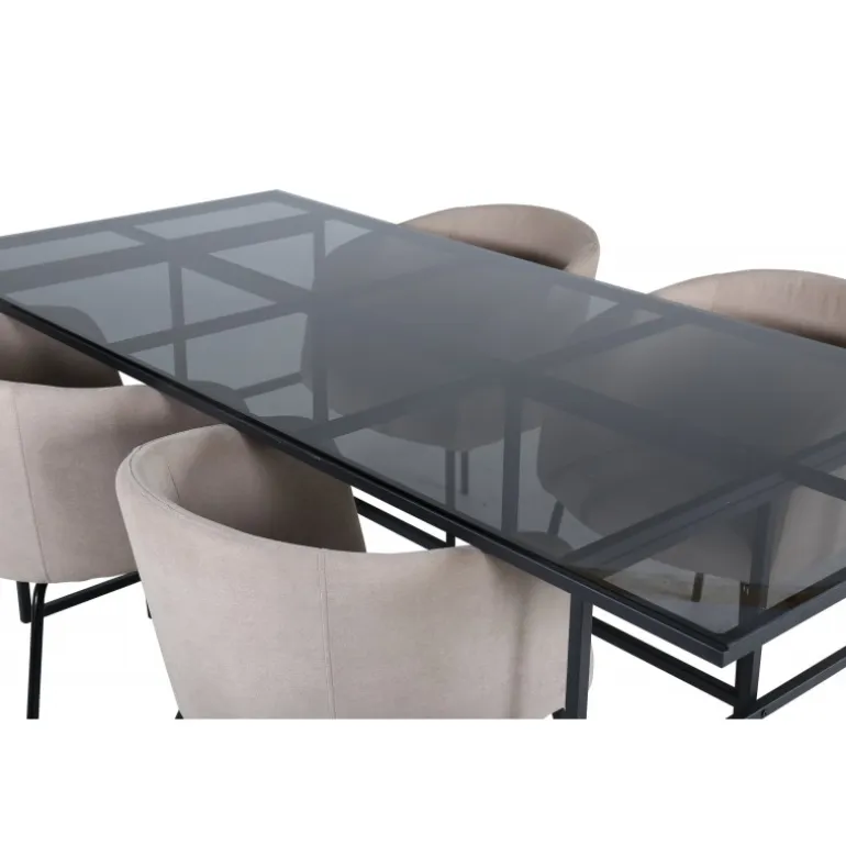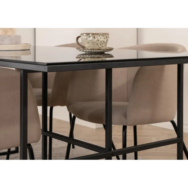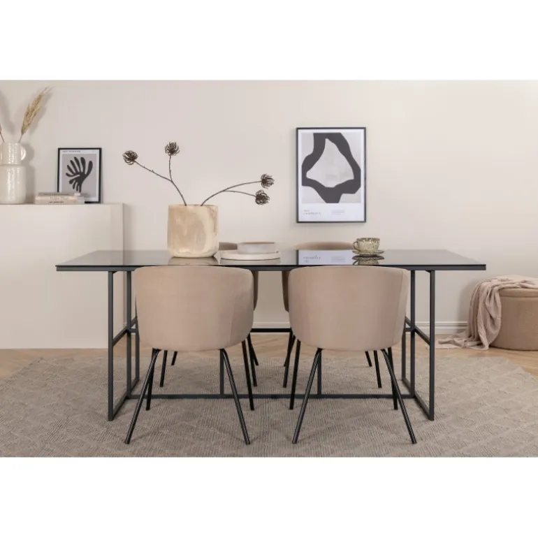 Tag din indretning til næste niveau med et moderne Spisebordssæt i slankt design! Leif spisebord skaber hurtigt et blikfang med sit industrielle look og lige, minimalistiske former. Bordpladen er i røgfarvet sort glas for en stilfuld helhed og stellet af sort metal. Bordets dimensioner: Længde: 200cm, Bredde: 90cm, Højde: 74cm. Her i perfekt kombination med 4 Berit spisestole i beige polyester linned og smalle stoleben i sort jern. Stolens dimensioner: Højde: 78cm, sædehøjde: 49cm, bredde: 55cm, dybde: 55cm. Et Spisebordssæt med fokus på komfort og elegance!
