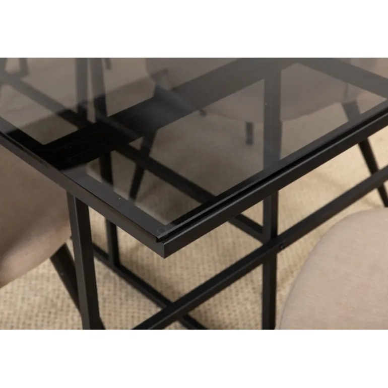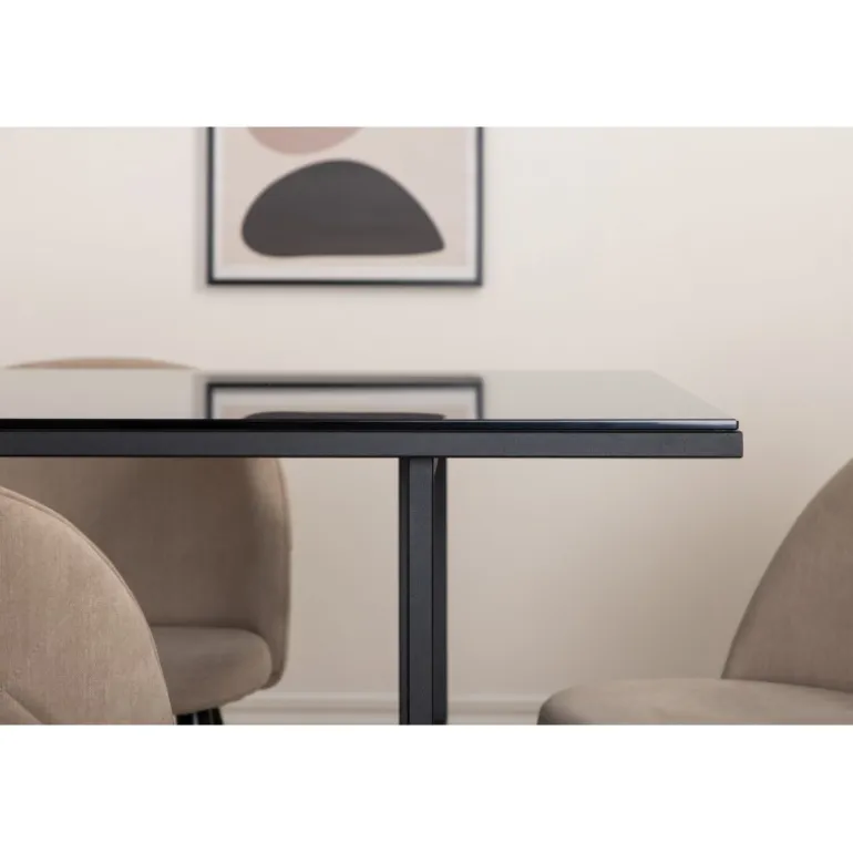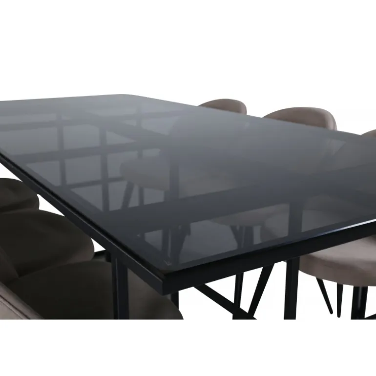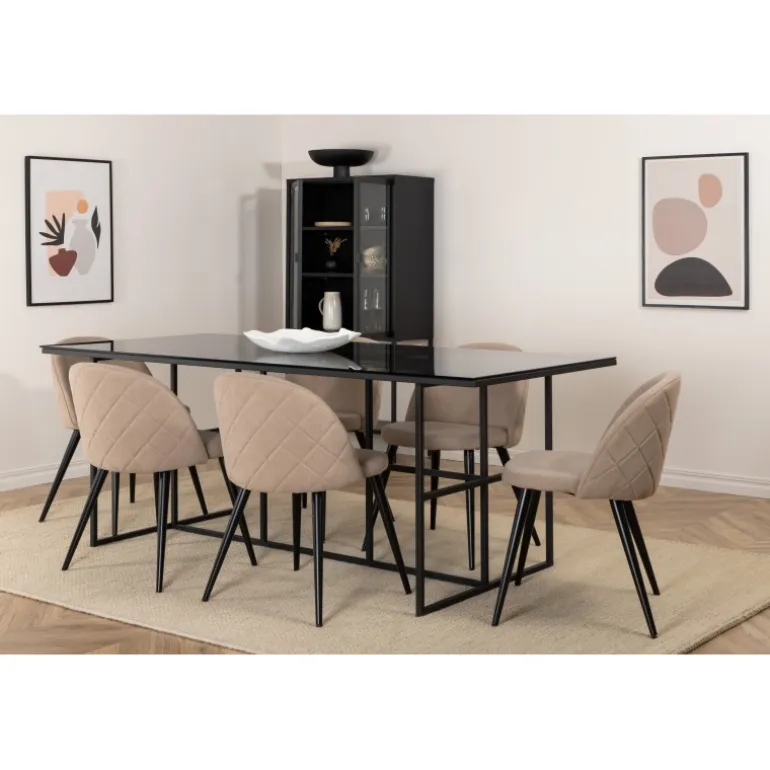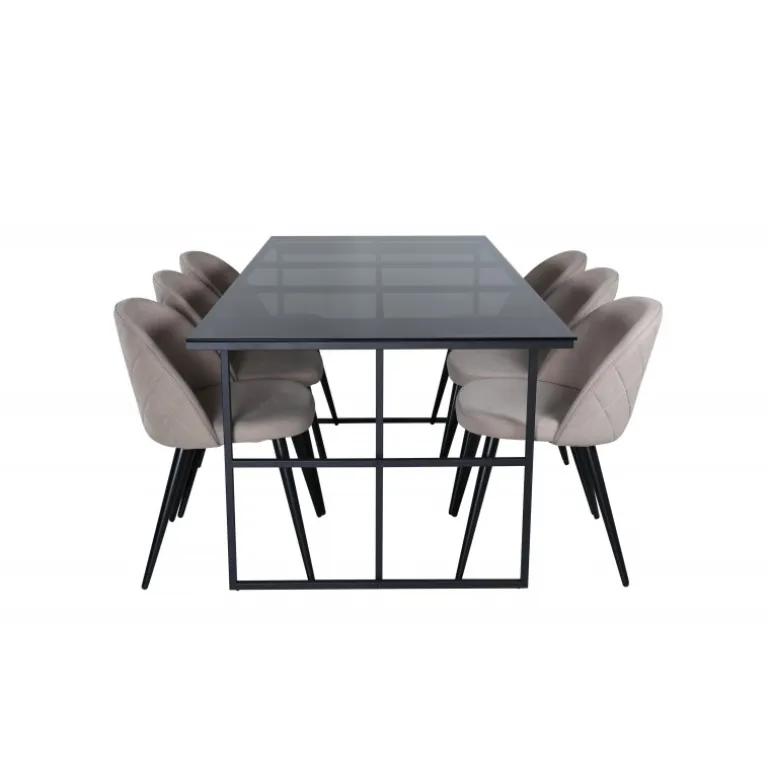 Pynt stuen moderne og stilfuldt! Spisebordet Leif har et iøjnefaldende design med en elegant bordplade i røget sort glas og stel i sort metal – inspireret af de industrielle vægge, der klatrer på trendlisterne. Bordets dimensioner: Længde: 200cm, Bredde: 90cm, Højde: 74cm. Matchet med 6 fløjls-spisestole med dekorative syninger i det beige sæde af polyesterlinned og sorte stoleben i jern. Stolens dimensioner: Højde: 76,5cm, sædehøjde: 46,5cm, bredde: 50cm, dybde: 57cm. Inviter til mange hyggelige måltider fremover!