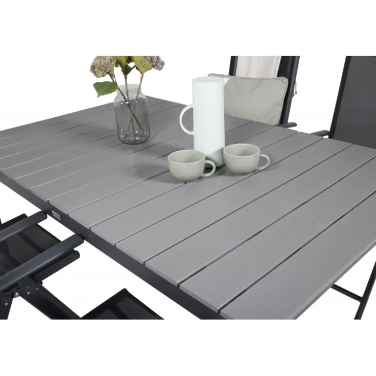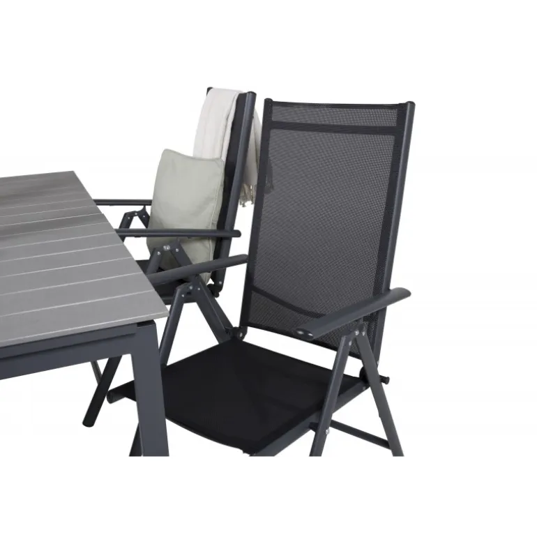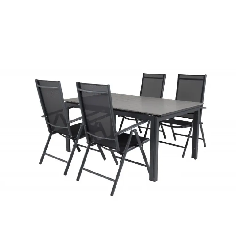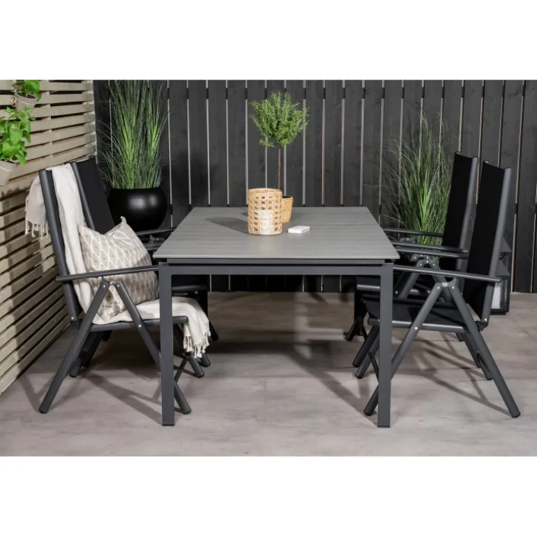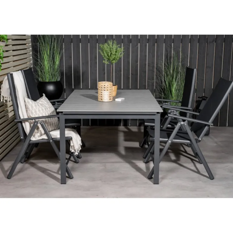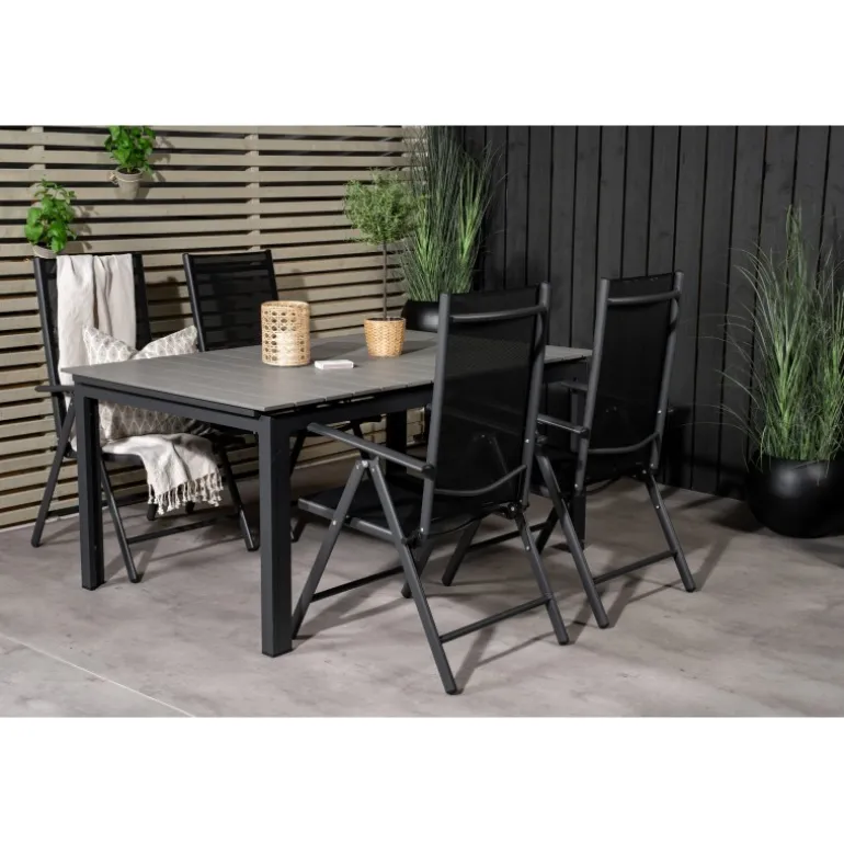 Vores populære foldbare spisestole i Break-serien sammen med spisestuebordet Levels i klassisk stil! Den perfekte kombination for dem, der søger en stilfuld og praktisk Loungesæt – Havemøbelsæt til at dekorere terrassen med. Fremstillet af aintwood, aluminium og textilene, er dette sæt både holdbart og let at vedligeholde. Aintwood-bordpladen kræver særlig pleje for at undgå deformering ved høje temperaturer. Ideelt til udendørs brug med en elegant grå bordplade og sorte stole.