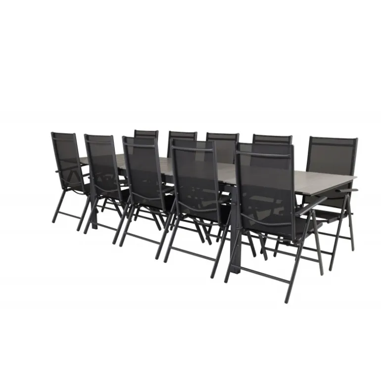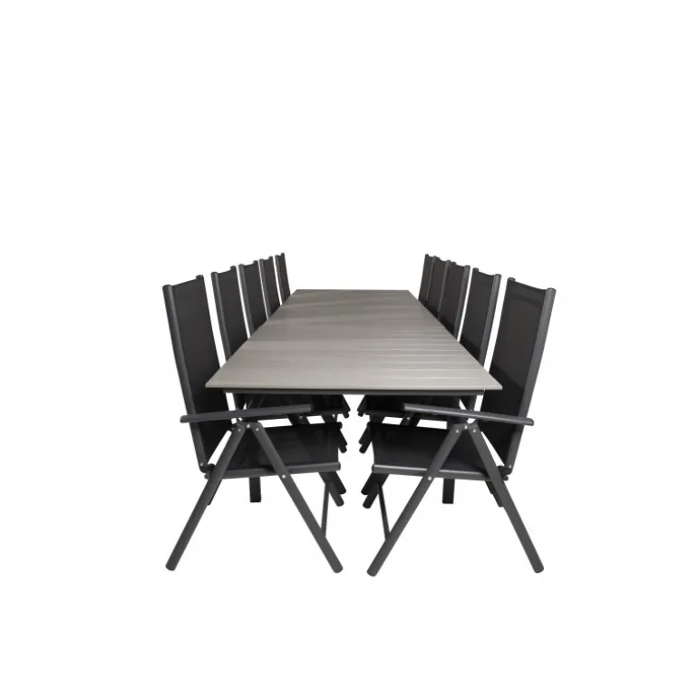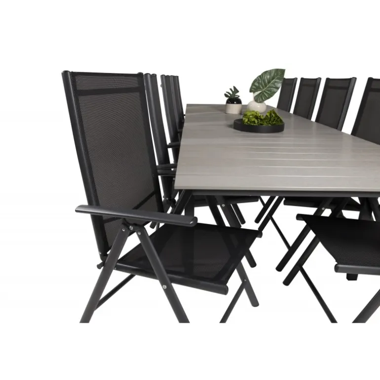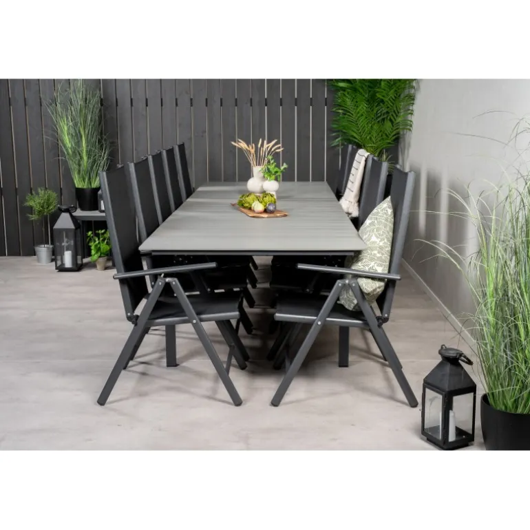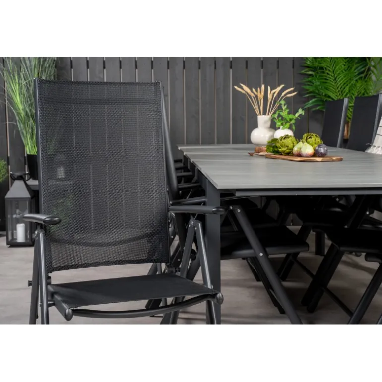 I et konsekvent sort og lige design får du en madgruppe, der holder over tid. Spisebordet Levels sammen med 5-positionsstole i Break-serien. Dette Loungesæt – Havemøbelsæt er ideelt til udendørs brug og kombinerer holdbarhed med stilfuldt design. Materialerne aintwood, aluminium og textilene sikrer, at sættet er modstandsdygtigt over for vejrets påvirkninger, mens den mørkegrå bordplade tilføjer en moderne touch til din udendørs indretning.