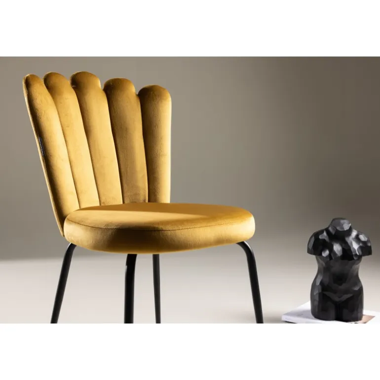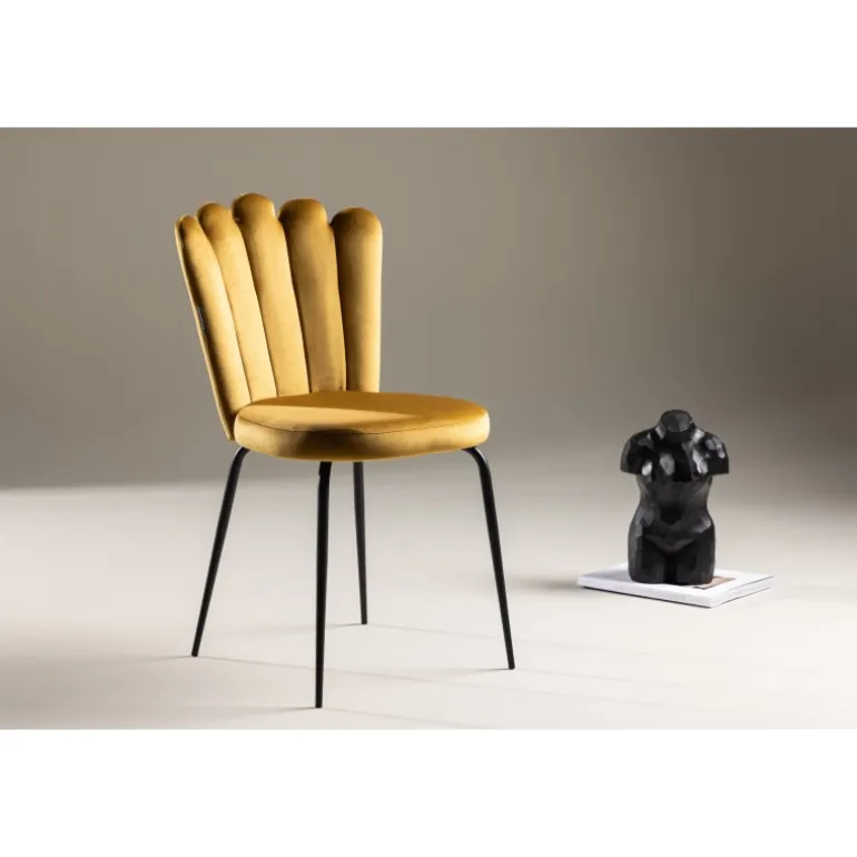 En moderne farveklik kan nemt løfte interiøret til næste niveau! Limhamn spisebordsstol er en moderne favorit i mange husstande. Den har et indbydende design med en dekorativ ormformet ryg med dekorative sømme og et rundt sæde i gult velourstof. Benene er i sort pulverlakeret metal. Skab en behagelig blikfang i hjertet af hjemmet! Lettere samling er påkrævet. Plejeråd: Brug tekstilspray til at imprægnere tekstilet, før du begynder at bruge det, det vil også gøre snavs og pletter lettere at fjerne i fremtiden. Fjern pletter med det samme, gnid ikke, men forsøg at suge op forsigtigt med en klud.
