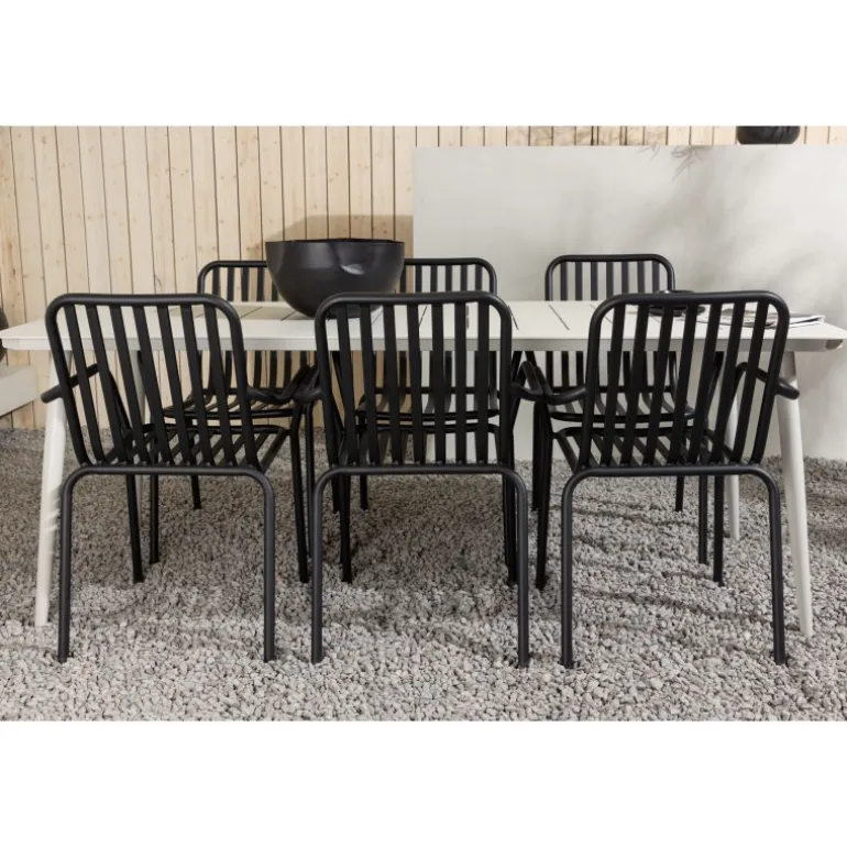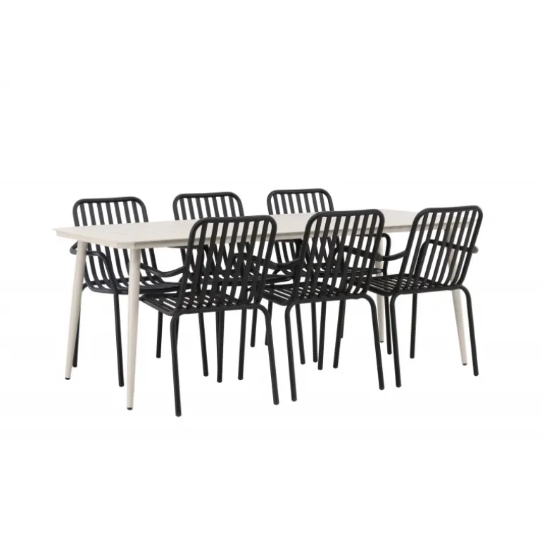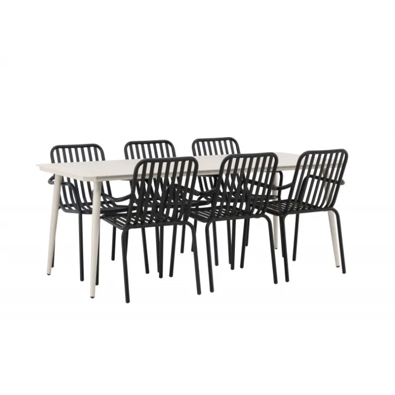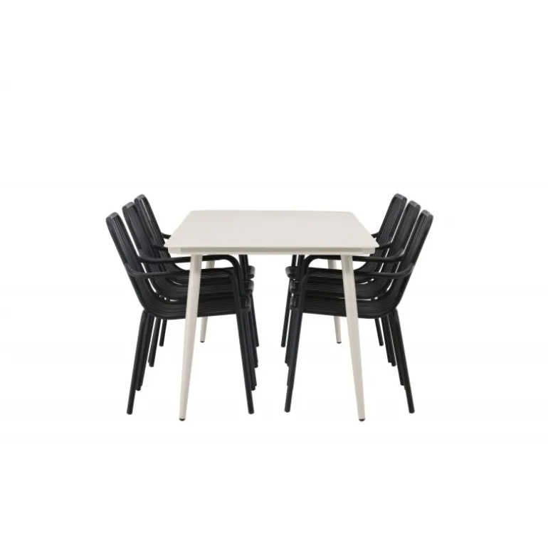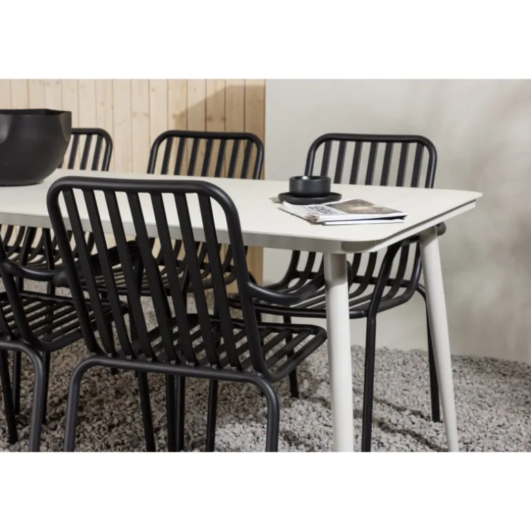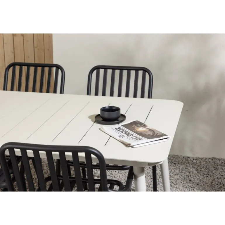 En moderne spisestuegruppe i perfekt match! Lina er et rektangulært spisebord, der er perfekt til både fester og hverdagsliv. Med et enkelt design i beige stål og let skrånende ben, er bordet både klassisk og moderne. Her sammen med spisestole fra serien Beijing. Stolens ribbede design og sorte farve gør stolen både moderne og tidløs. Indret terrassen i trend-sikre farver og charmerende skandinavisk design! Bordmål: 200×90 cm.
