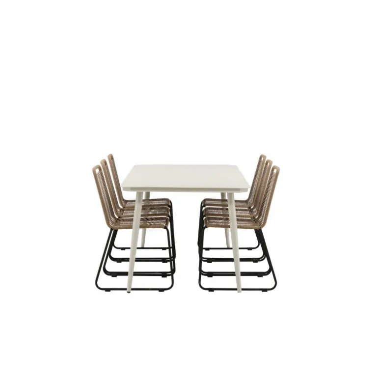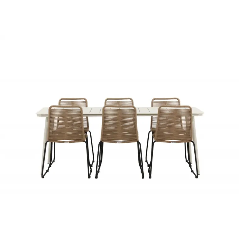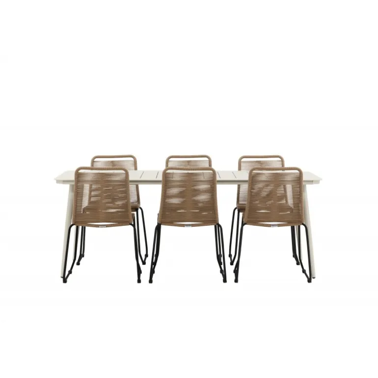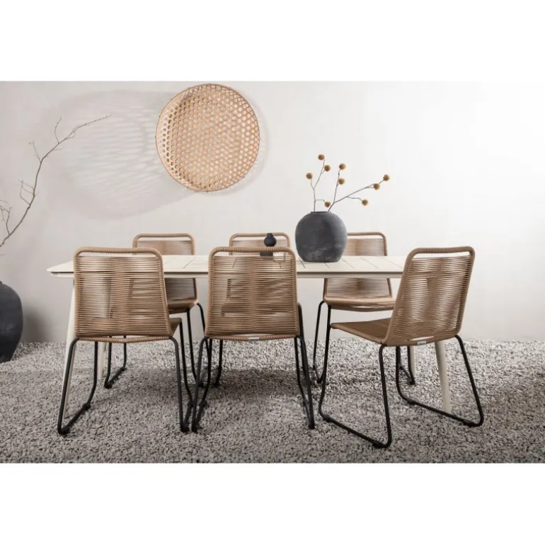 Skab et moderne blikfang i udestuen! Spisebordet Lina har en minimalistisk konstruktion i beige stål med en rektangulær bordplade og let skrånende ben. Her sammen med vores populære spisestole fra Lindos-serien. Stolen er lavet af holdbare materialer med et sæde i reb i en jordnær beige nuance og ben i sort metal. Her får du en spisestuegruppe, der både er komfortabel og en fryd for øjet! Bordmål: 200×90 cm.