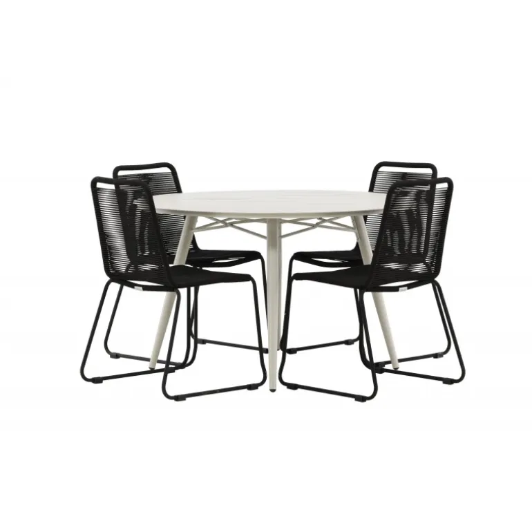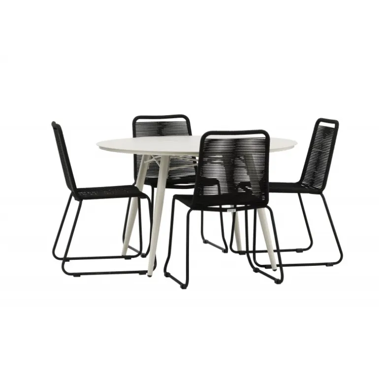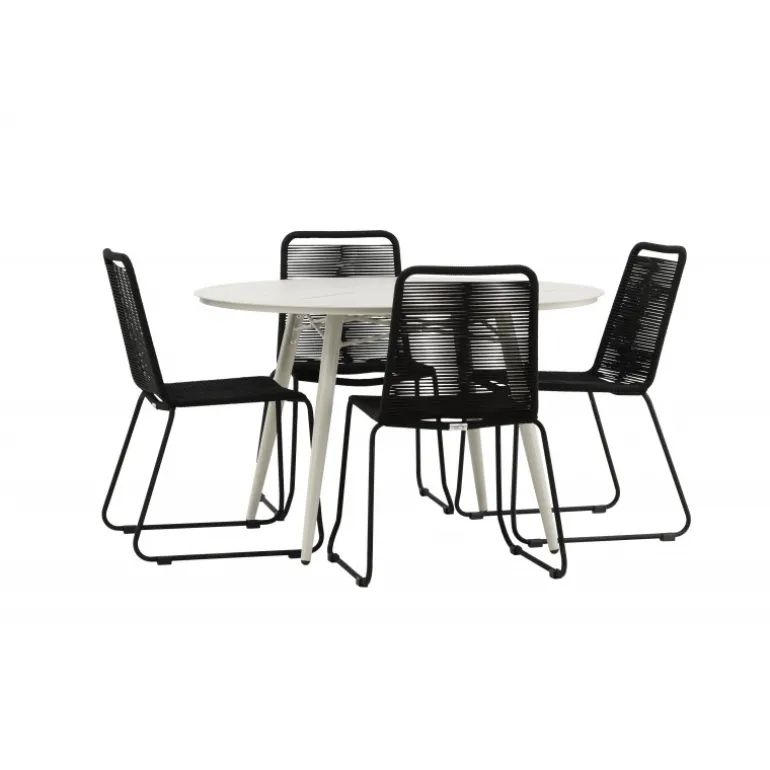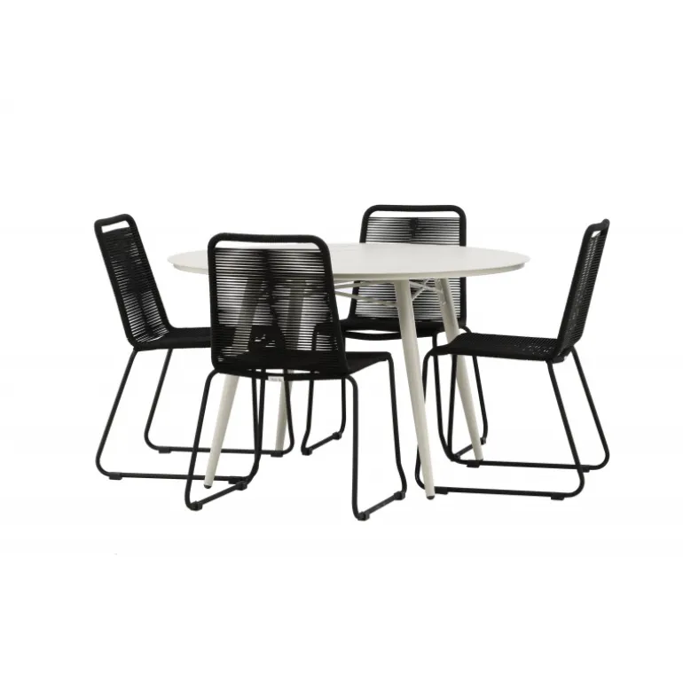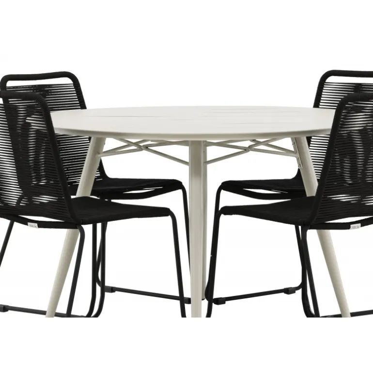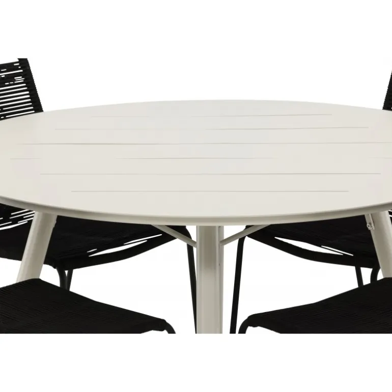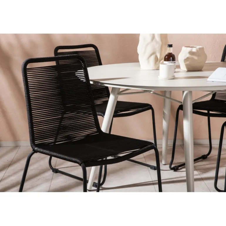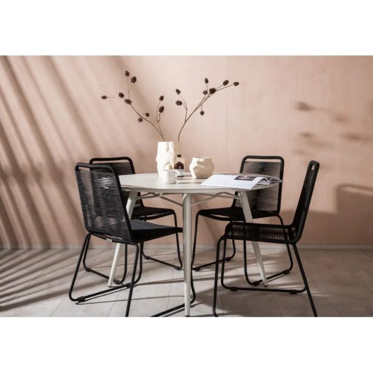 Det er et match – en moderne farvekombination, der skaber et modebevidst indtryk i udendørsområdet. Lina bordet har et minimalistisk design i hvid/beige stål, med en rektangulær bordplade og blødt afrundede kanter. Bordbenene er let udsvingede og giver et stabilt indtryk. Dimensioner: 200×90 cm. Her sammen med de trend-sikre spisebordsstole fra Lindos serien. Stolene har smalle ben i sort aluminium og et sæde i holdbart, sort reb. Indret indbydende på terrassen og skab et blikfang, der imponerer!