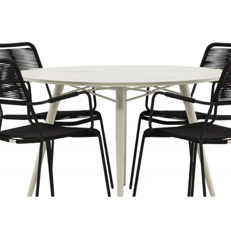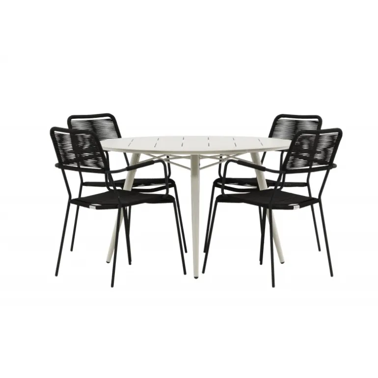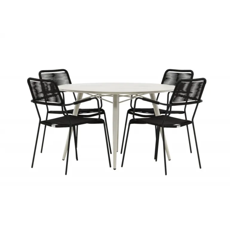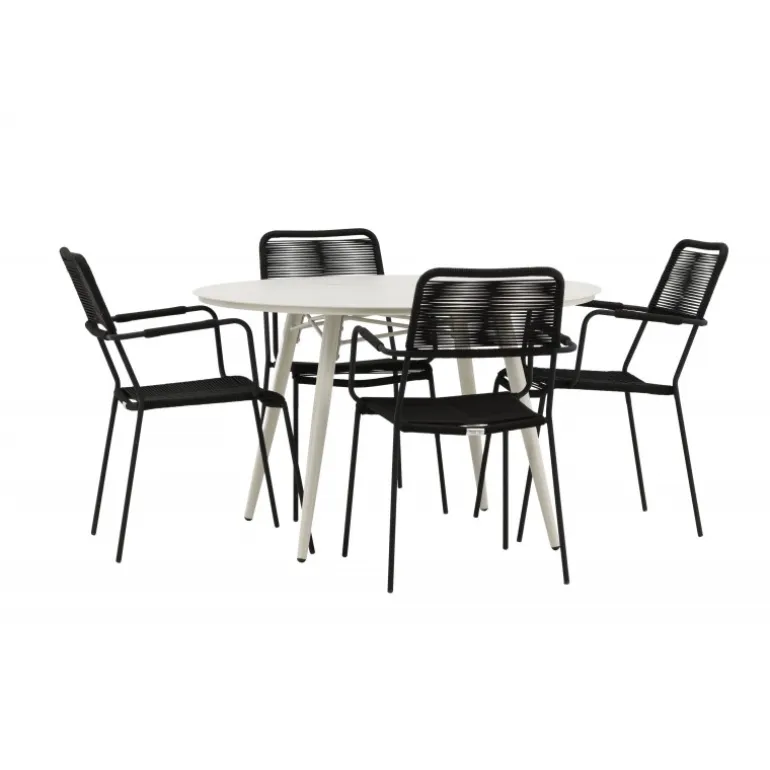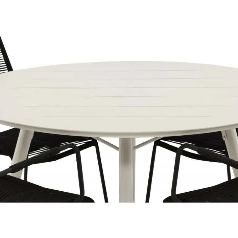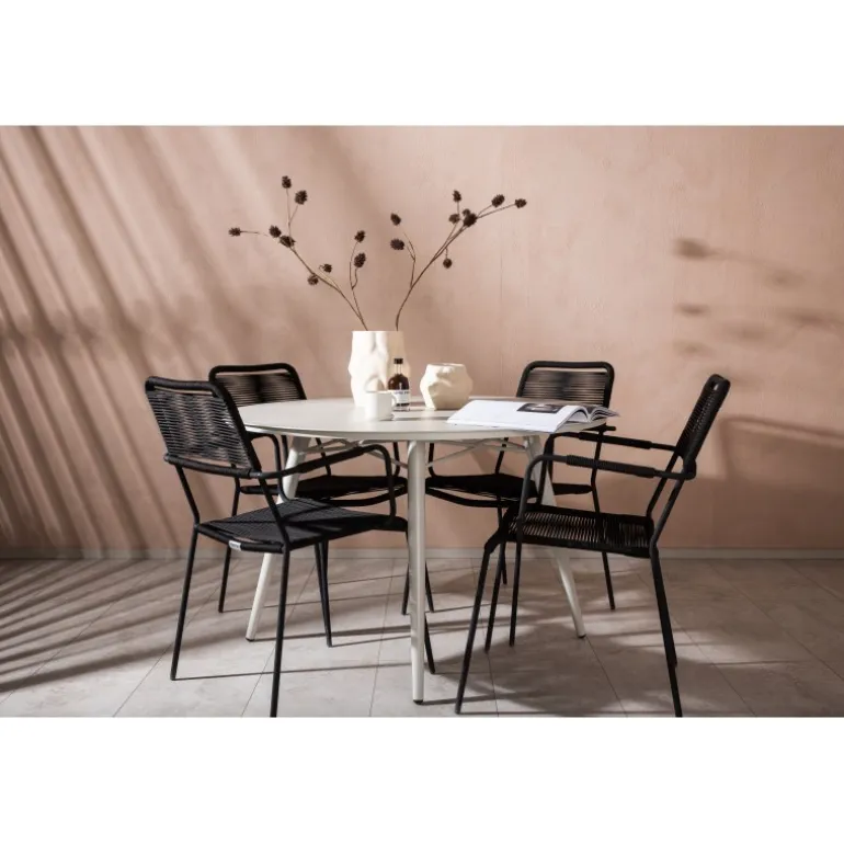 Det er et perfekt match – en moderne farvekombination, der skaber et modebevidst indtryk i udendørsområdet. Bordet Lina har et minimalistisk design i hvid/beige stål, med en rektangulær bordplade og bløde afrundede kanter. Bordbenene er let udadgående og giver et stabilt indtryk. Dimensioner: 200×90 cm. Her sammen med trendy spisebordsstole fra Lindos-serien. Stolene har integrerede armlæn i sort aluminium og et sæde i holdbart, sort reb. Skab en indbydende atmosfære på terrassen og skab et blikfang, der imponerer!