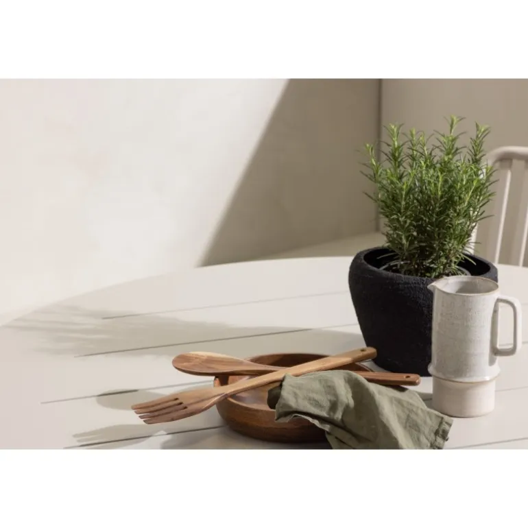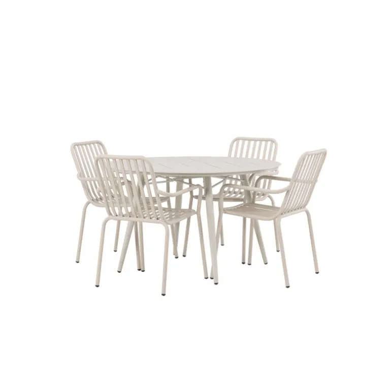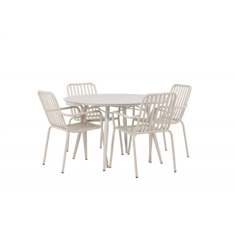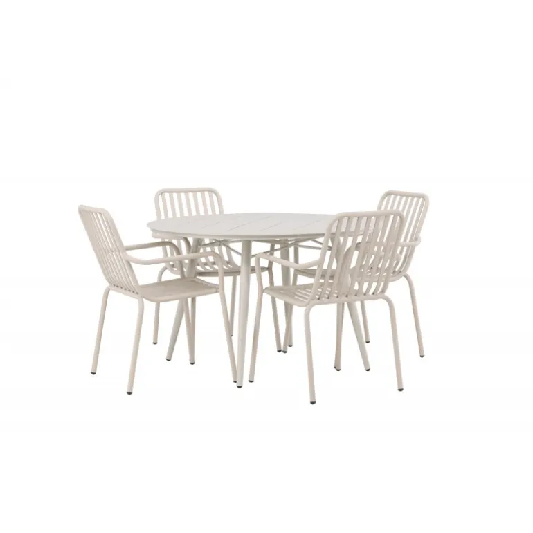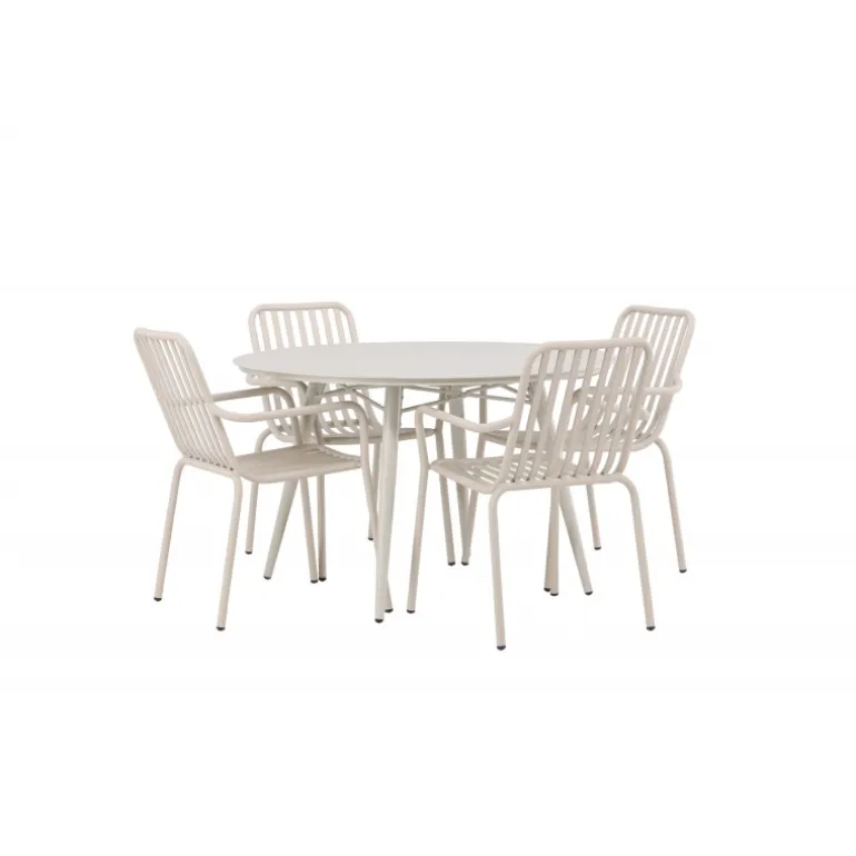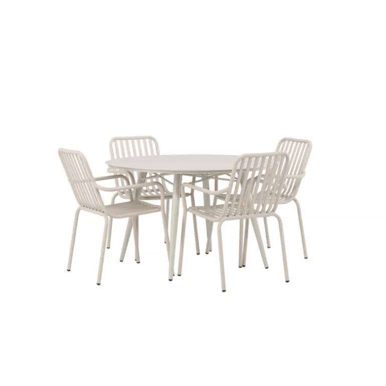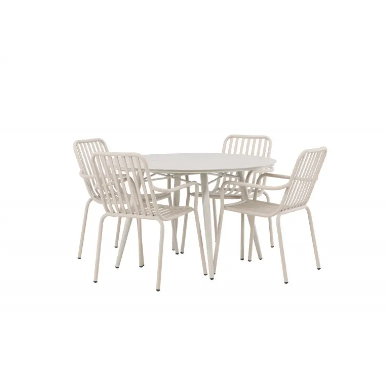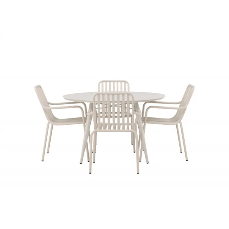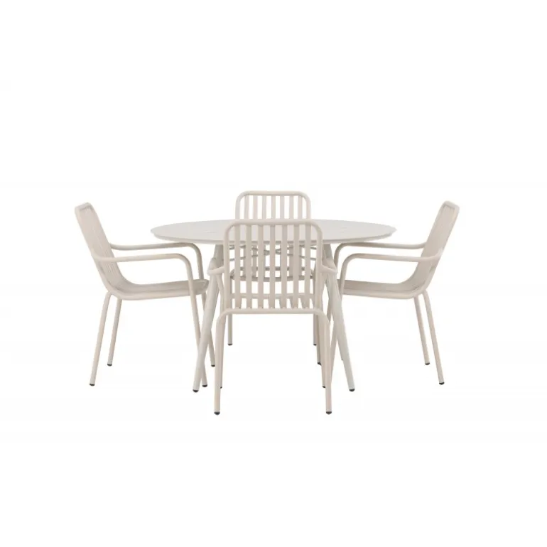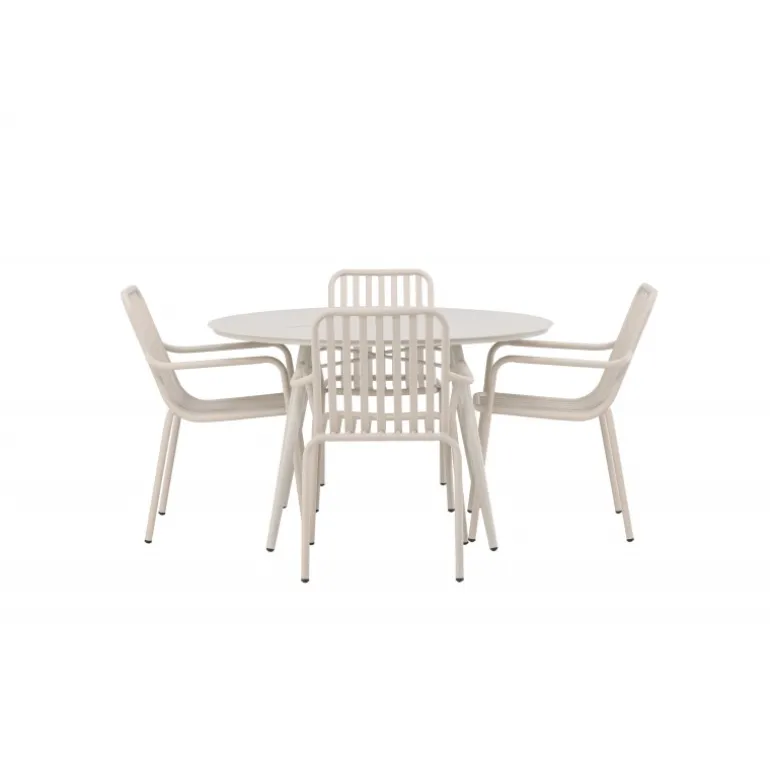 Møbler vinterhaven lys og frisk op! Det enkle, men elegante, runde spisebord fra Lina-serien har et klassisk design og varm beige farve. Bordpladen er tynd med dekorative revner, og bordbenene er let udsvingede; konsekvent lavet af stål. Her i en stilfuld kombination med 4 af vores moderne spisestole fra Beijing-serien. Stolens ribbede design og cremede beige farve får det til at føles både moderne og tidløst. Dette er en matchende Loungesæt – Havemøbelsæt, der aldrig går af mode! Bord diameter: 120 cm. Montering kræves.
