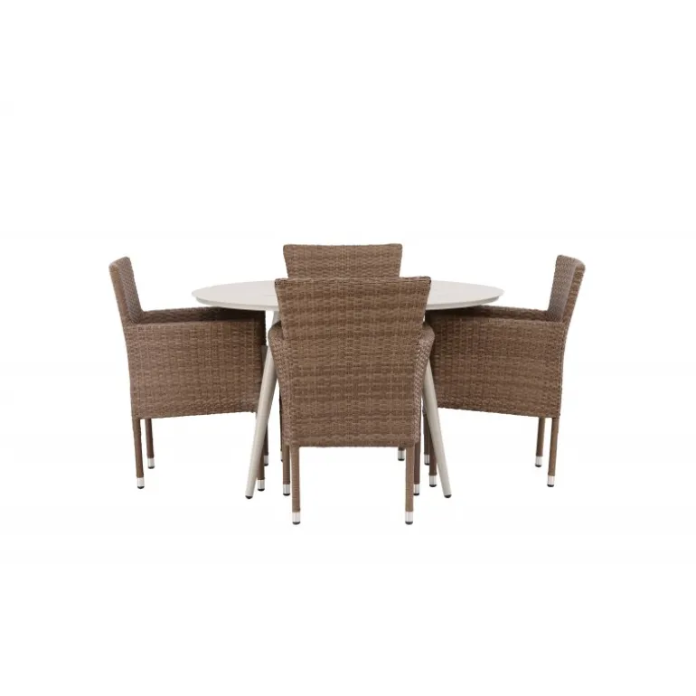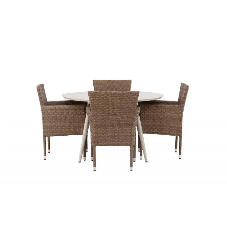 Sid behageligt og indret indbydende – her ender ingen på kanten! Det enkle men elegante, runde spisebord fra Lina-serien har et friskt design og en varm beige farve. Bordpladen er tynd med dekorative revner, og bordbenene er let udadgående; konsekvent lavet af stål. Her sammen med 4 af vores komfortable spisebordsstole fra Malina-serien. Stolen har en aluminiumsramme og er polstret med fletvævet, beige kunstig rattan. Den perfekte Loungesæt – Havemøbelsæt til alle sommerens måltider! Bordets diameter: 120 cm.