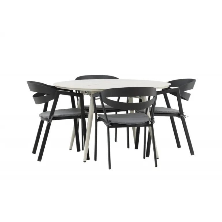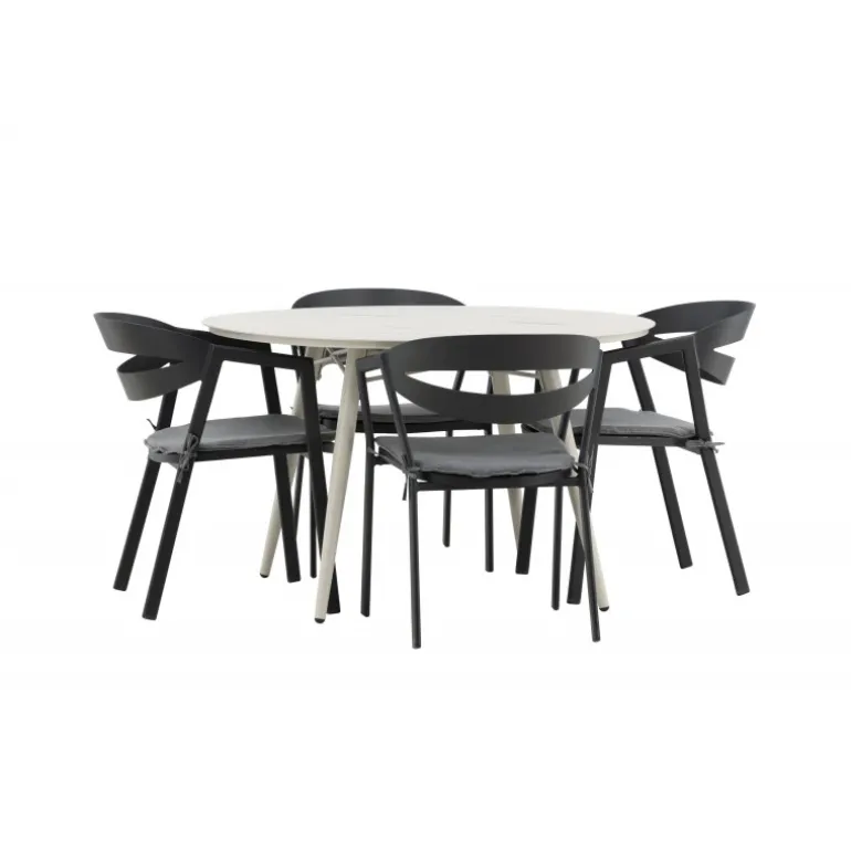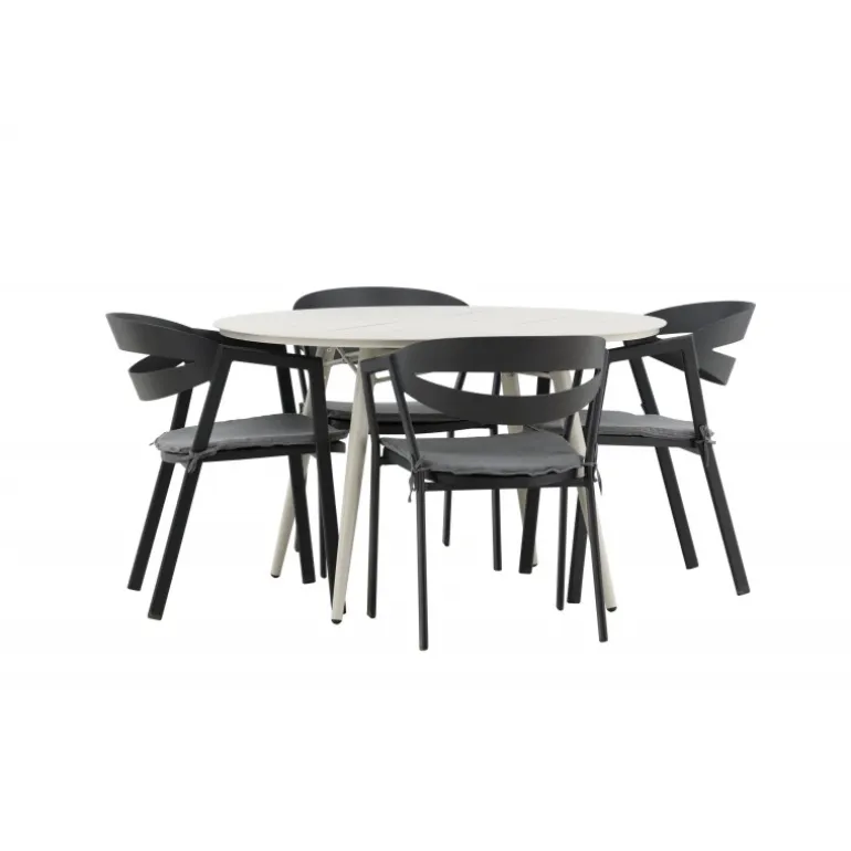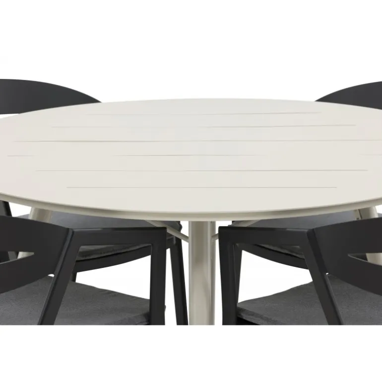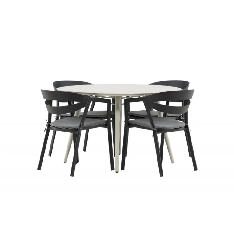 Et lækkert matchende Loungesæt – Havemøbelsæt er præcis, hvad der er nødvendigt for at friske terrassen op denne sommer! Bordet Lina har et minimalistisk design i hvid/beige stål med en rund bordplade og let udsvingende bordben. Dimensioner: 120ø cm. Her i en modebevidst kombination med spisestole fra serien WORD. Stolene har integrerede armlæn i sort aluminium og en grå pude for ekstra komfort. Sid behageligt og nyd hyggelige måltider!