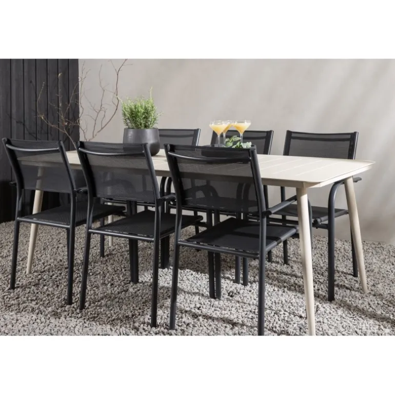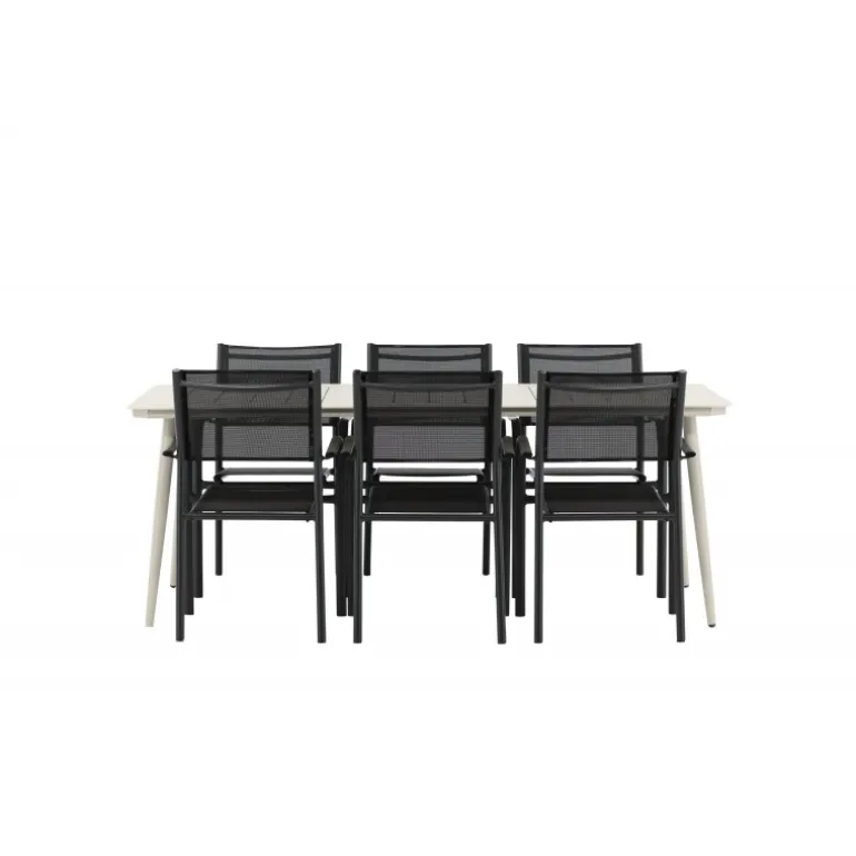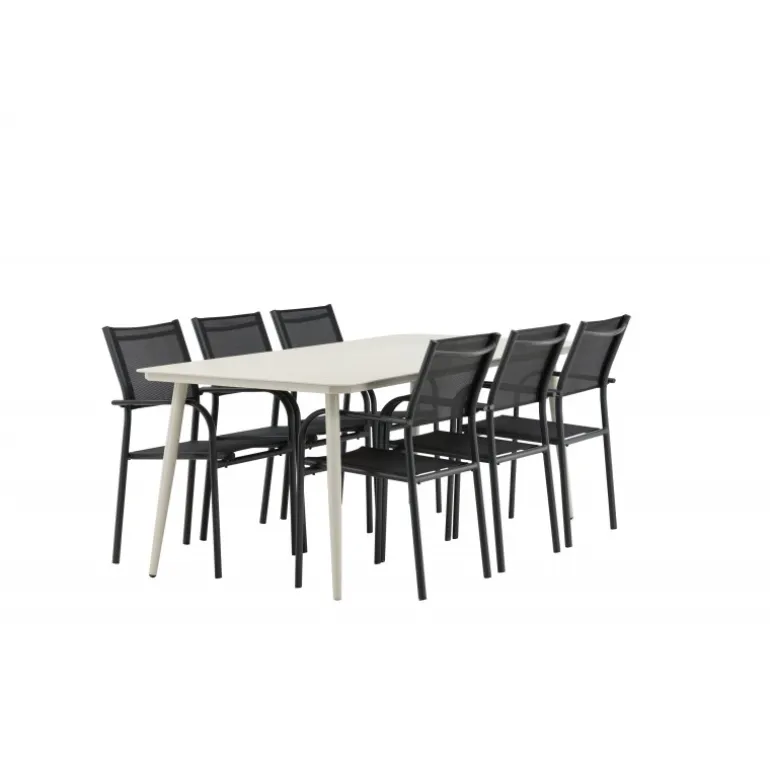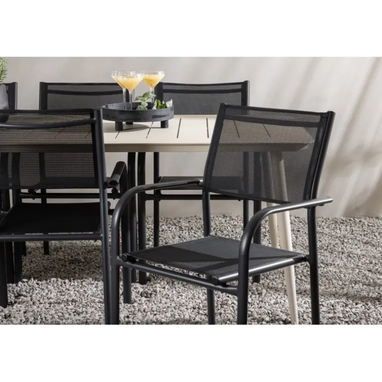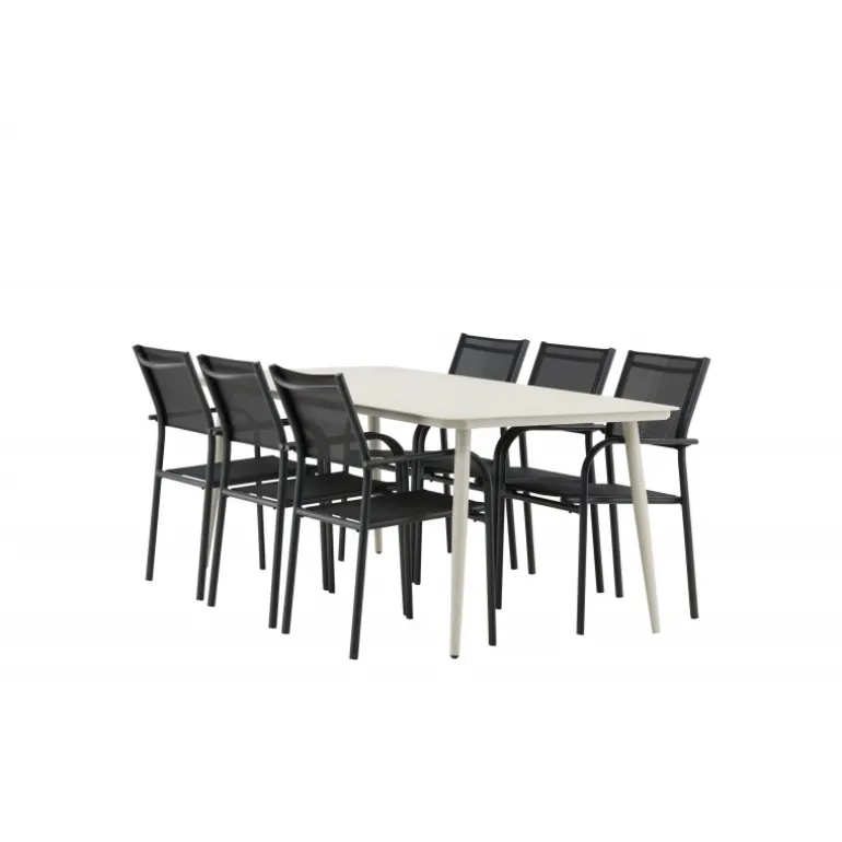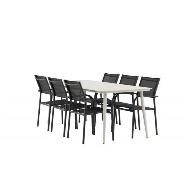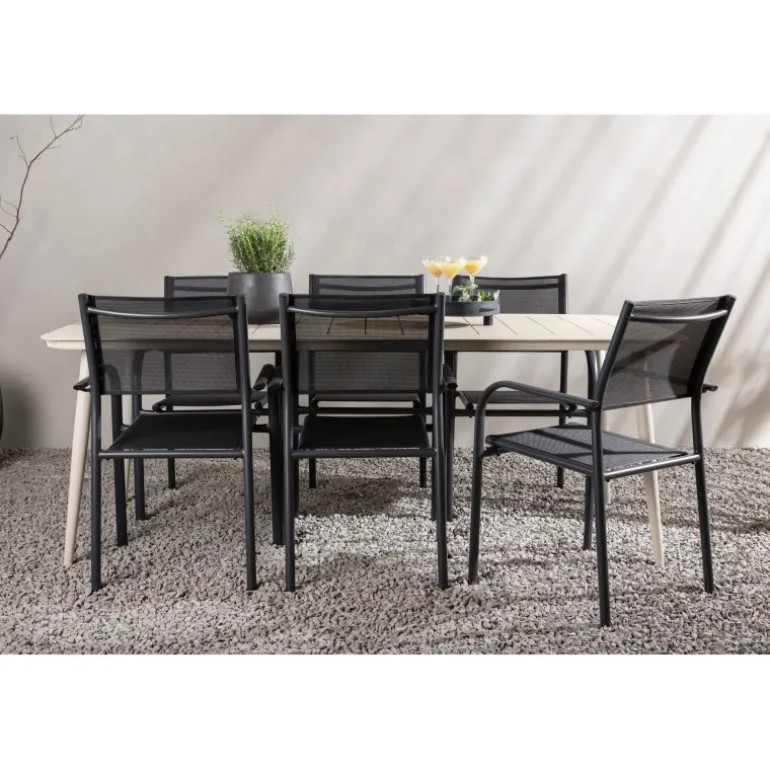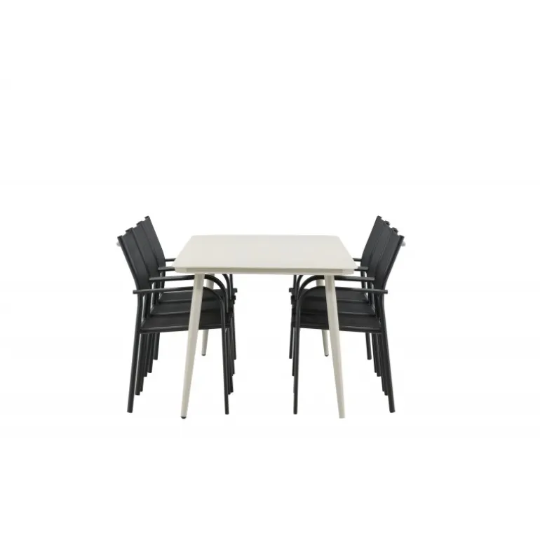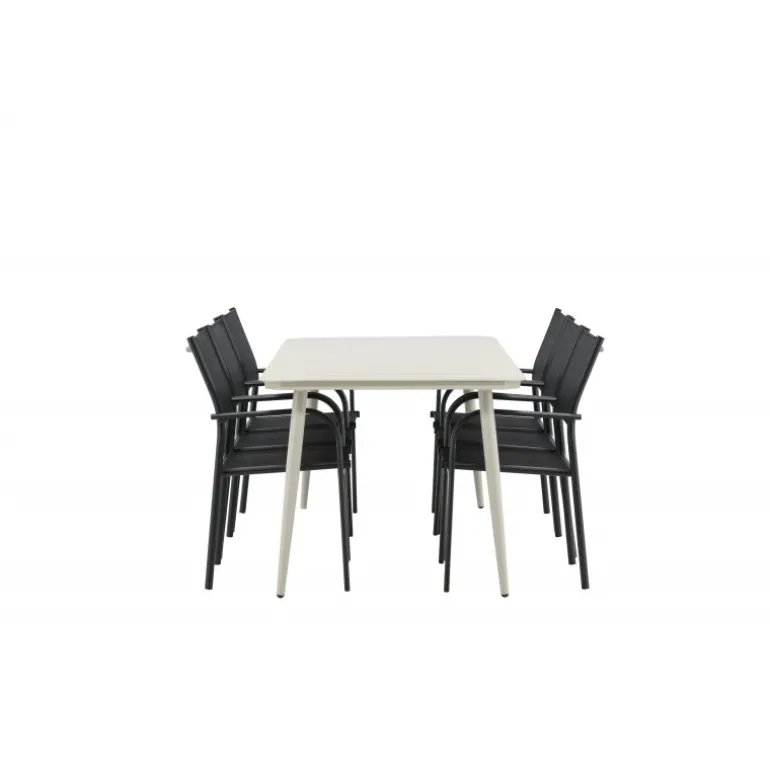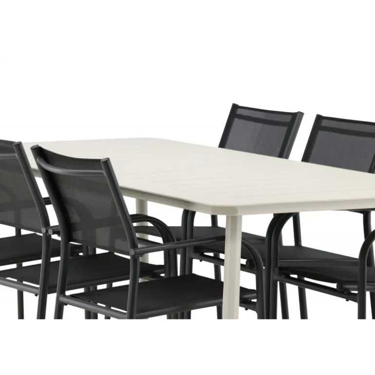 Det er et match – en moderne farvekombination, der skaber et modebevidst indtryk i udendørsområdet. Lina-bordet har et minimalistisk design i hvid/beige stål med en rektangulær bordplade og bløde afrundede kanter. Bordbenene er let udadgående og giver et stabilt indtryk. Dimensioner: 200×90 cm. Her sammen med komfortable spisestole fra Santorini-serien. Stolene har lige nordiske former med integrerede armlæn i aluminium og sæde i sort tekstil. Lad tiden her blive dagens højdepunkt!