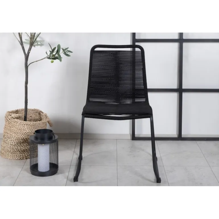 Lindos i sit tidløse og stilfulde design gør sig perfekt sammen med andet haveinventar. Takket være det holdbare materiale i reb og den klassiske sorte farve, er den blevet en favorit i mange husholdninger. Kombinér med et lækkert spisebord og nyd måltider udendørs denne sommer! Stolen er stabelbar. Plejevejledning: Vores reb er lavet af høj kvalitet spundet polyester, som er nem at rengøre. Møblerne er behandlet til at modstå 500-2000 timers sollys. Vi anbefaler sæbe og vand til rengøring. Lad lufttørre. For områder, der er sværere at nå, kan en lille børste bruges forsigtigt. Brug aldrig højtryksrenser eller stærke kemikalier til at rengøre rebet.