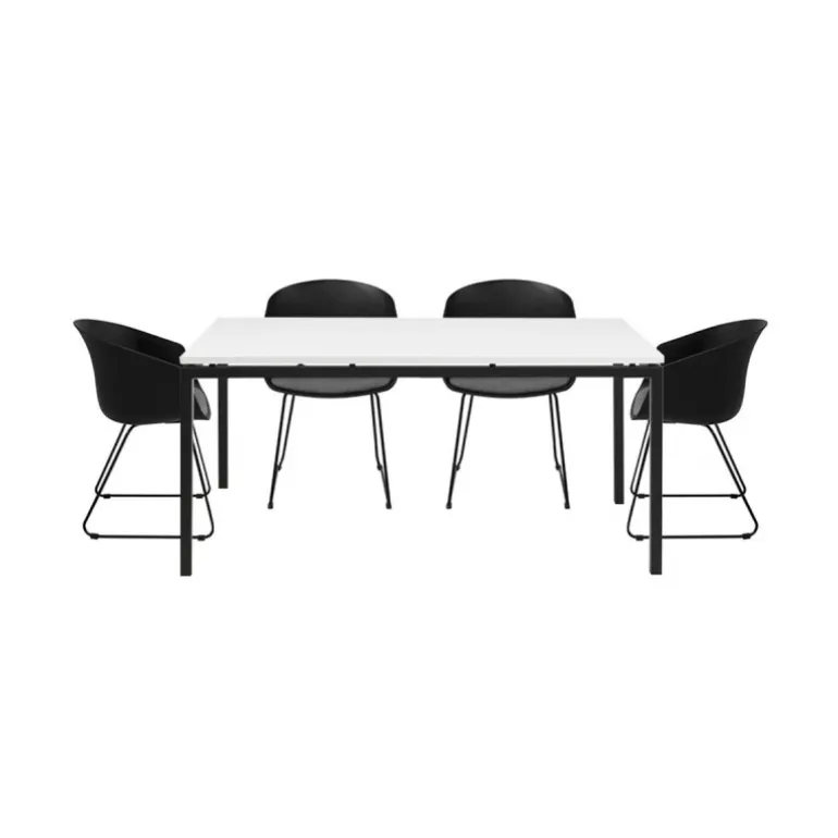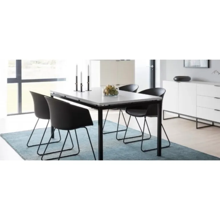 Elegant spisebordssæt i funktionelt design med slankt sort stålstel og hvidlakeret bordplade. Livorna spisebordet 160x90cm er udført med rene linjer og har et indbydende udtryk, som går godt i spænd med mange stilarter.