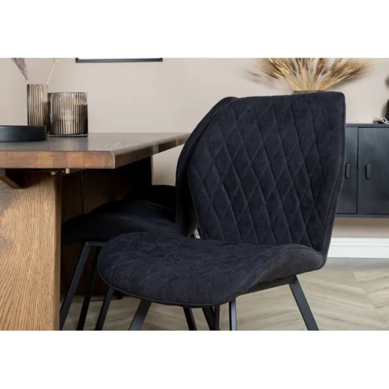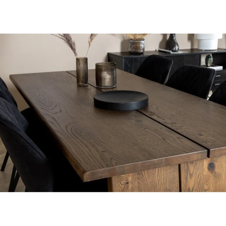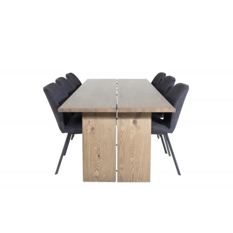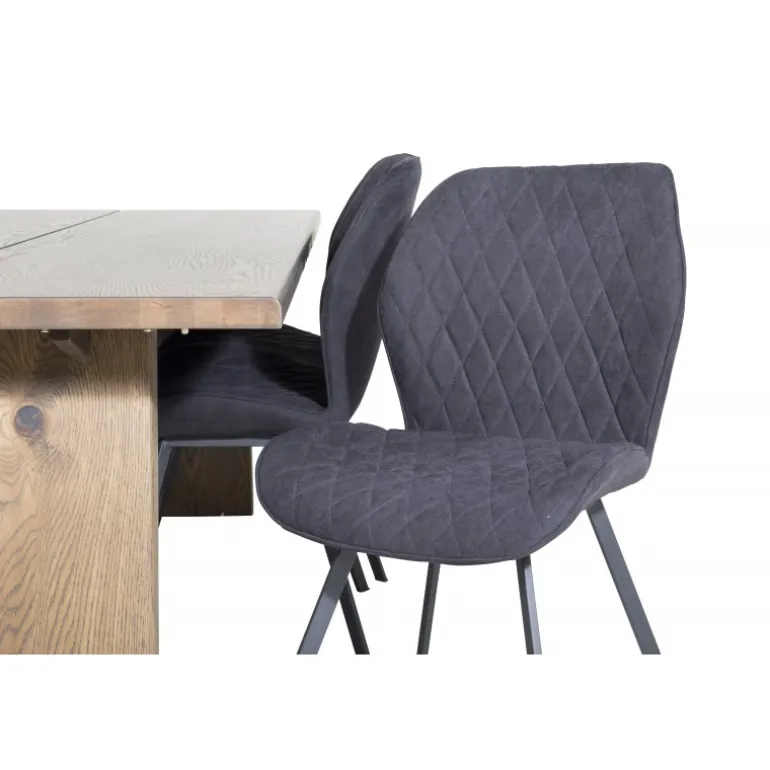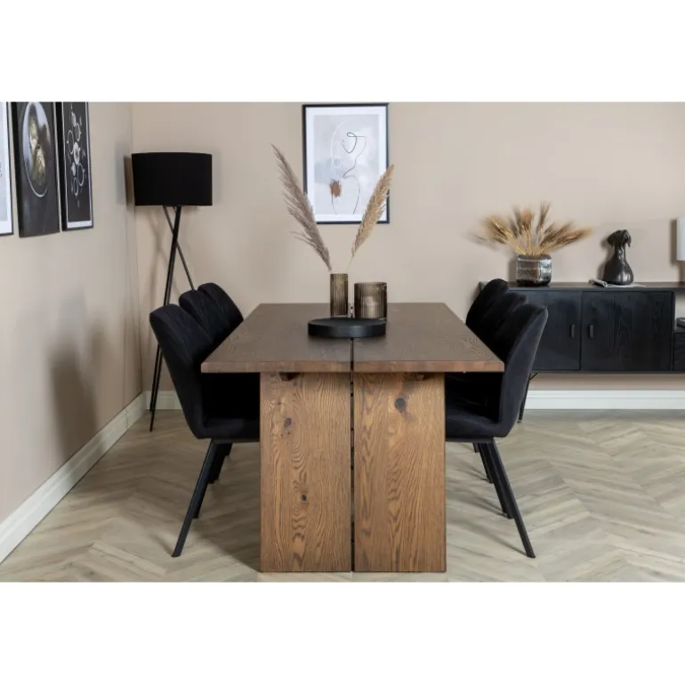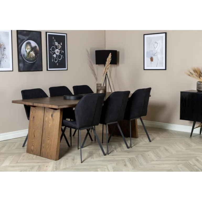 En madgruppe med et rustikt og stilfuldt design! Logger, vores udtrækkelige spisebord i en trendy træfinish, er her kombineret med klassiske spisebordsstole fra Gemma-serien. Lad hjemmets hjerte præges af din nye madgruppe, som indgyder en varm og luksuriøs følelse. Logger Rektangulær Spisebordssæt er perfekt til at skabe en indbydende spiseoplevelse. Med en robust egetræsbordplade og elegante sorte stole, tilbyder dette sæt både funktionalitet og æstetik.