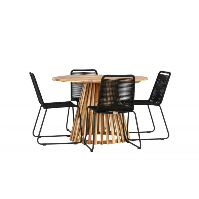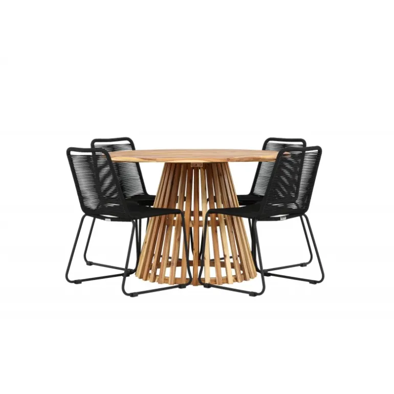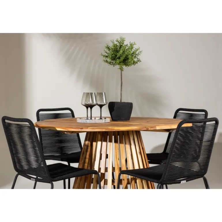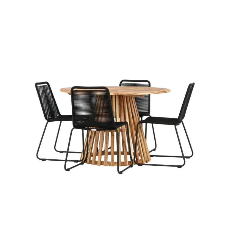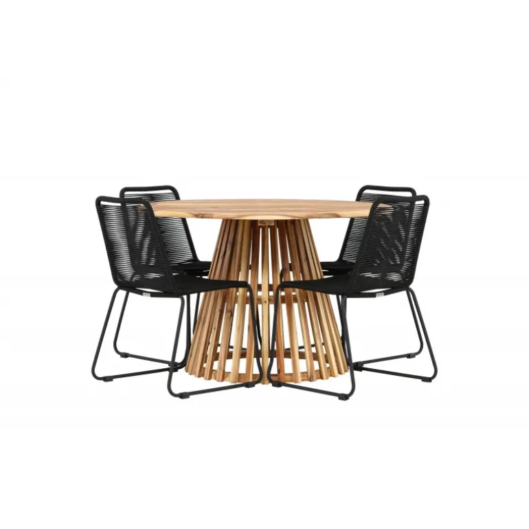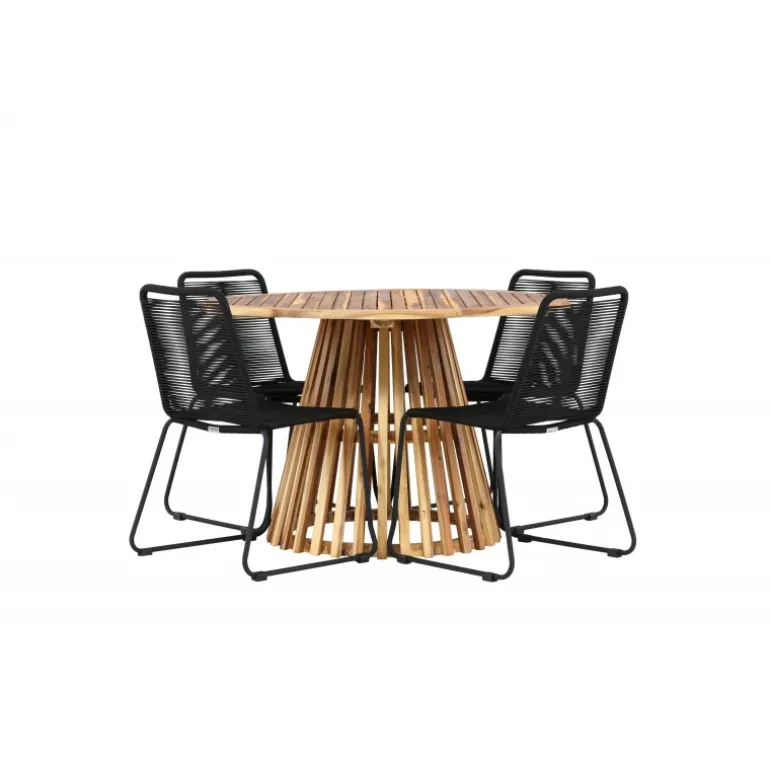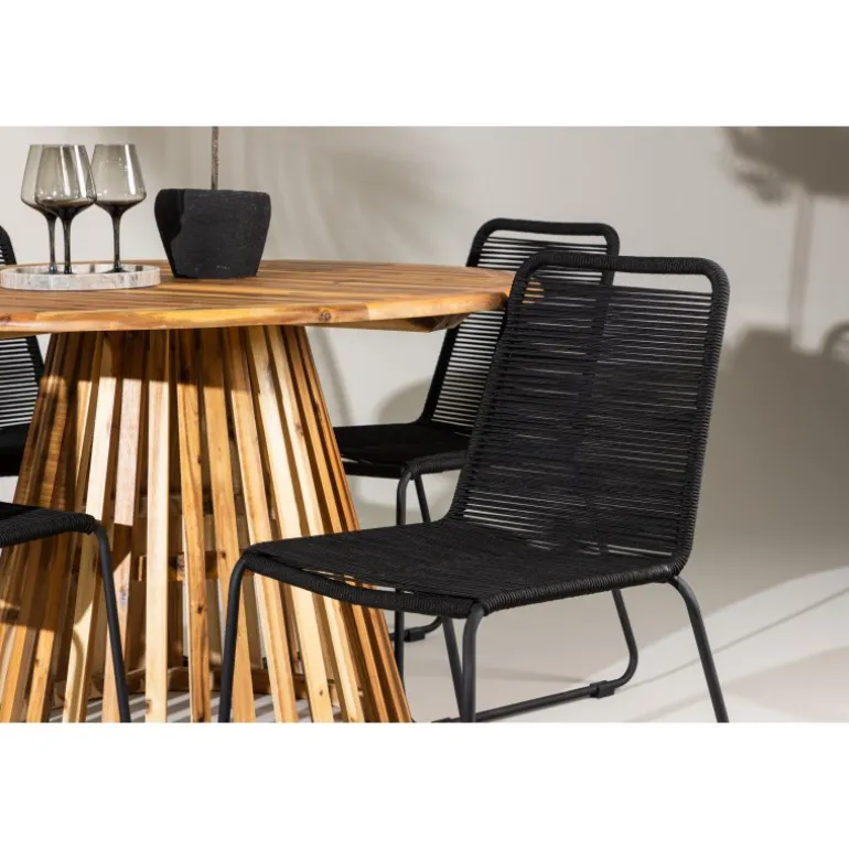 Oplev det ultimative Loungesæt – Havemøbelsæt til dit udendørs område med vores elegante Lumpur bord og stilfulde Lindos stole. Med en imponerende diameter på 120 cm tilbyder Lumpur bordet masser af plads til familiemiddage og hyggelige sammenkomster under åben himmel. Fremstillet af akacietræ giver Lumpur bordet en naturlig og indbydende atmosfære til dit udendørs miljø. Dets naturlige farve blender perfekt med omgivelserne, hvilket skaber en fredfyldt stemning, som du og dine gæster vil elske. Lindos stolene er lavet af stål, hvilket giver dem en robust og holdbar konstruktion til udendørs brug. Stolens elegante sorte farve tilfører et sofistikeret touch til din udendørs spisestue og komplementerer bordets naturlige træfarve på en stilfuld måde. Dette Loungesæt – Havemøbelsæt leveres komplet med fire komfortable stole, ideelle til afslappende måltider og sociale sammenkomster udendørs. Med Lumpur og Lindos Loungesæt – Havemøbelsættet kan du skabe et indbydende og stilfuldt udendørs miljø, hvor din familie og gæster kan nyde hinandens selskab fuldt ud.
