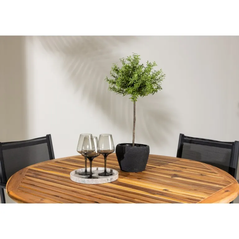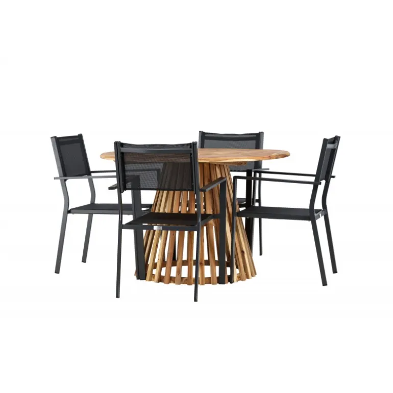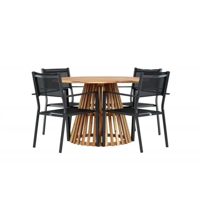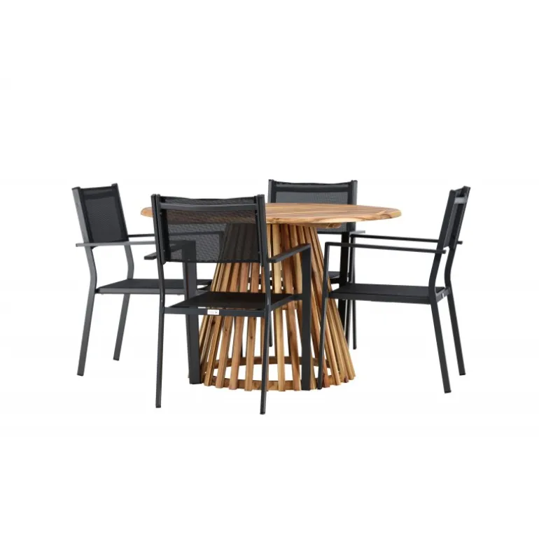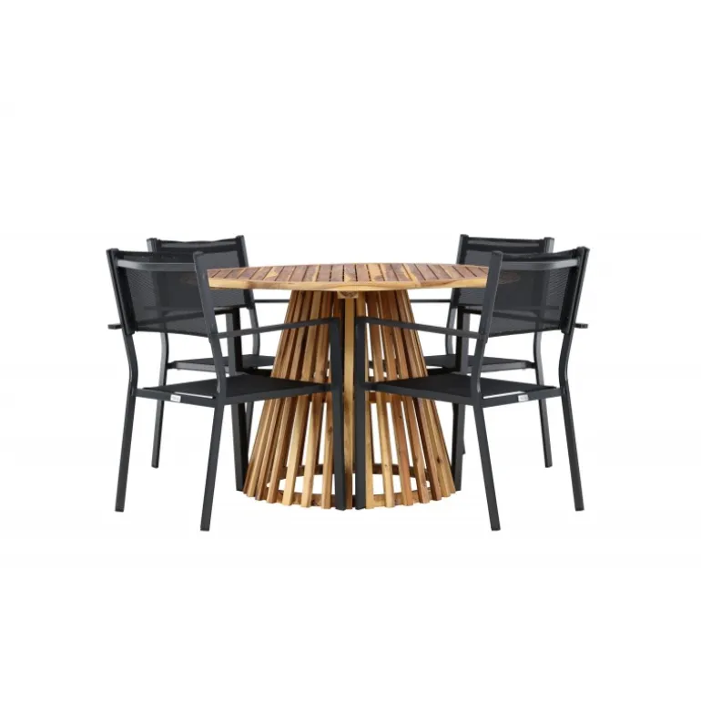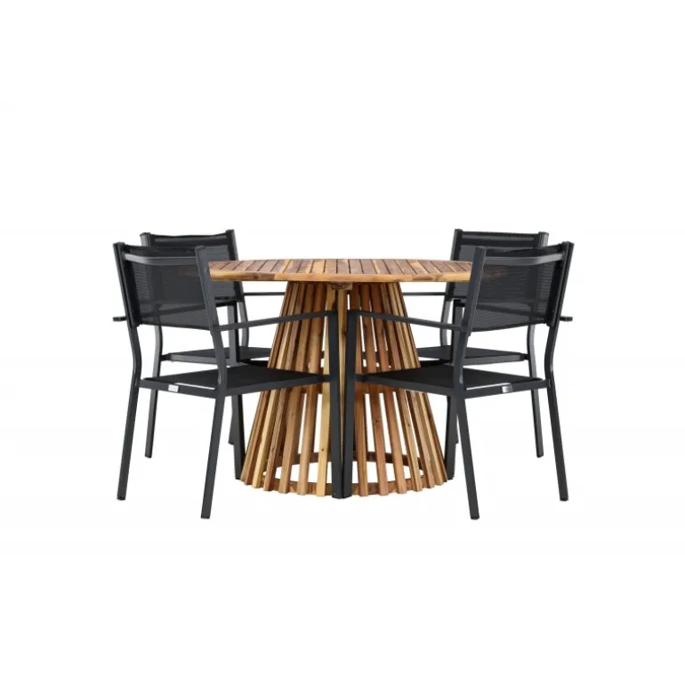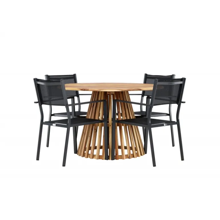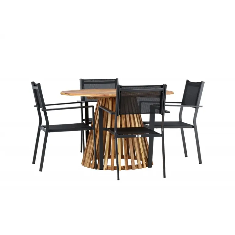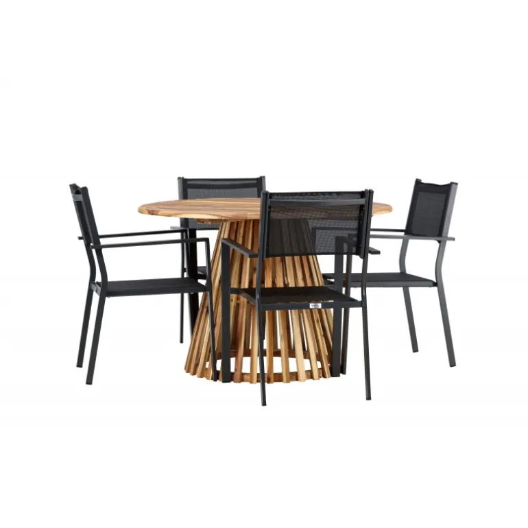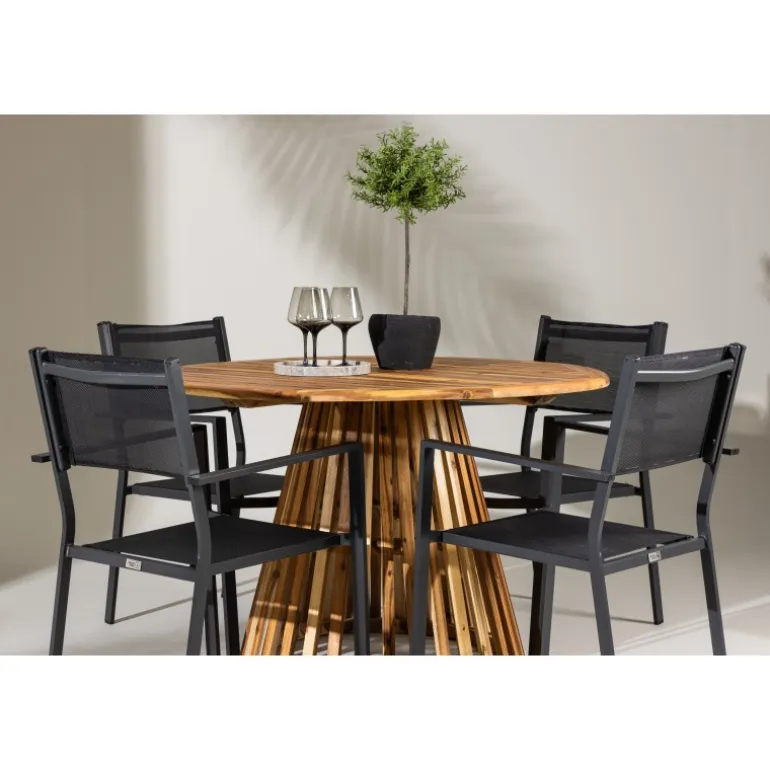 Opdag det perfekte Loungesæt – Havemøbelsæt til dit hjem med Lumpur bordet og Copacabana stolene. Med en diameter på 120 cm, tilbyder Lumpur bordet generøs plads til familiemiddage og sammenkomster med venner. Fremstillet af bæredygtigt akacietræ, bringer bordet en naturlig følelse til din spisestue eller terrasse. Copacabana stolene komplementerer Lumpur bordet med deres moderne design og pålidelige aluminiumskonstruktion. Stolene i sort farve tilføjer et elegant touch til din spisestue og blander sig perfekt med bordets naturlige træfarve. Dette Loungesæt – Havemøbelsæt inkluderer fire komfortable stole, perfekt til familiemiddage og sociale sammenkomster. Uanset om det er hverdagens måltider eller specielle lejligheder, skaber Lumpur og Copacabana Loungesæt – Havemøbelsættet en indbydende atmosfære og et elegant look til dit hjem.
