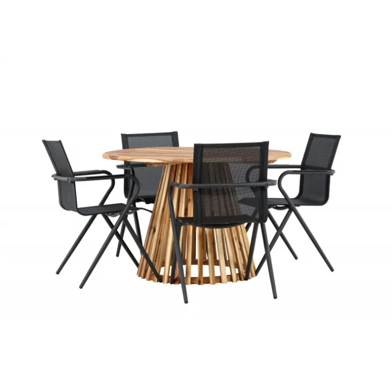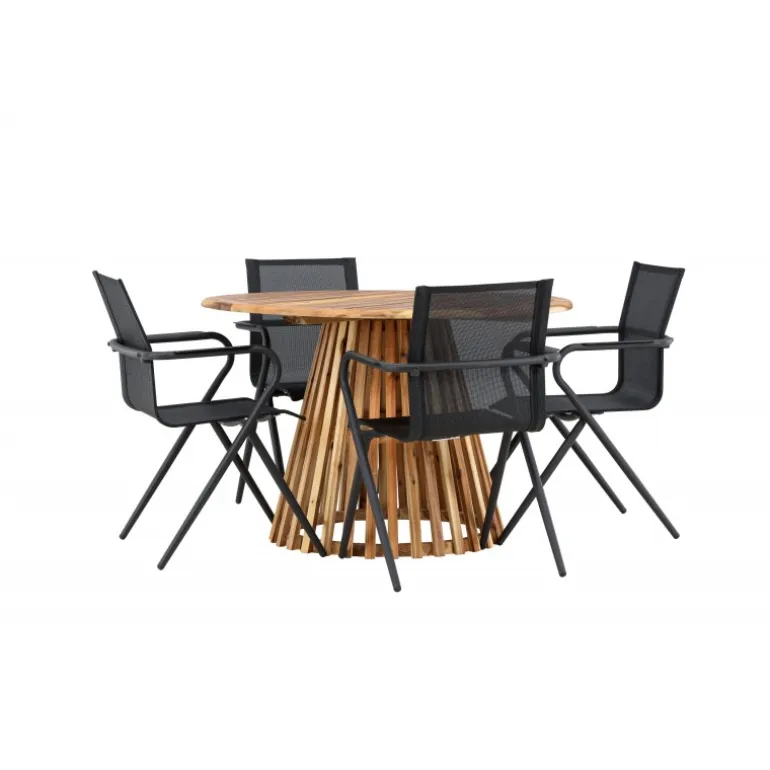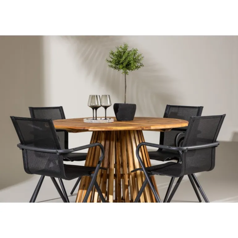 Oplev det perfekte Loungesæt – Havemøbelsæt til din terrasse eller have med vores elegante Lumpur bord og stilfulde Alina stole. Med en imponerende diameter på 120 cm giver Lumpur bordet masser af plads til familiemiddage og hyggelige sammenkomster under åben himmel. Fremstillet af akacietræ tilbyder Lumpur bordet en naturlig og indbydende atmosfære til dit udendørsmiljø. Den naturlige farve blander sig harmonisk med omgivelserne, hvilket skaber en fredelig atmosfære, hvor du og dine gæster kan slappe af og nyde lækre måltider. Alina stolene er lavet af aluminium, hvilket giver dem en holdbar konstruktion, der er egnet til udendørs brug. Stolens slanke sorte farve tilføjer et sofistikeret touch til din udendørs spisestue og komplementerer den naturlige træfarve på bordet på en stilfuld måde. Dette Loungesæt – Havemøbelsæt leveres komplet med fire komfortable stole, perfekt til afslappede måltider og sociale sammenkomster udendørs. Med Lumpur og Alina Loungesæt – Havemøbelsættet kan du skabe et indbydende og stilfuldt udendørsmiljø, hvor din familie og gæster kan nyde sig fuldt ud.