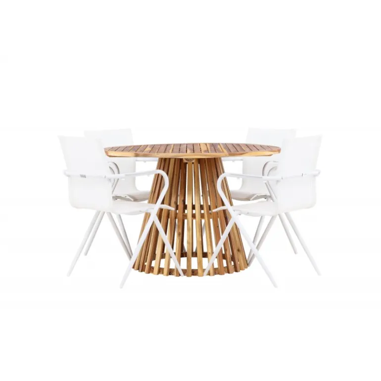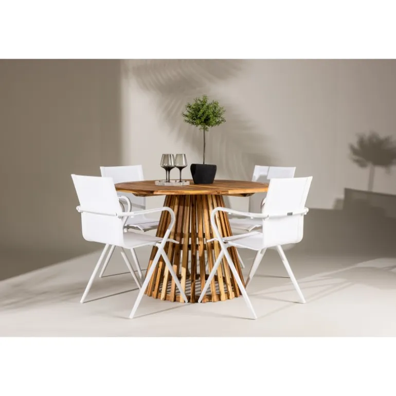 Oplev den perfekte fusion af moderne design og jordnær atmosfære med vores Loungesæt – Havemøbelsæt Alina og Lumpur. Dette elegante udendørs møbel er ideelt til at skabe mindeværdige øjeblikke med venner og familie på varme dage og lune aftener. Med fire slanke Alina stole og det charmerende Lumpur bord tilføjer dette Loungesæt – Havemøbelsæt et trendy touch til din terrasse eller have. Alina stolene, i en frisk hvid farve og med komfortable textilene sæder, kombinerer stil og komfort. Deres aluminiumsben giver stabilitet uden at gå på kompromis med designet. Lumpur bordet er midtpunktet i dette ensemble med sin naturlige farve og en diameter på 120 cm, lavet af akacietræ. Dets robuste konstruktion gør det til et pålideligt og holdbart udendørs møbel. Uanset om du samles til en afslappet grill-aften eller en festlig udendørs middag, vil Alina og Lumpur Loungesæt – Havemøbelsæt skabe en indbydende og stilfuld atmosfære, hvor fællesskab og samvær trives. Forbedr din udendørs oplevelse med dette stilfulde og funktionelle Loungesæt – Havemøbelsæt.
