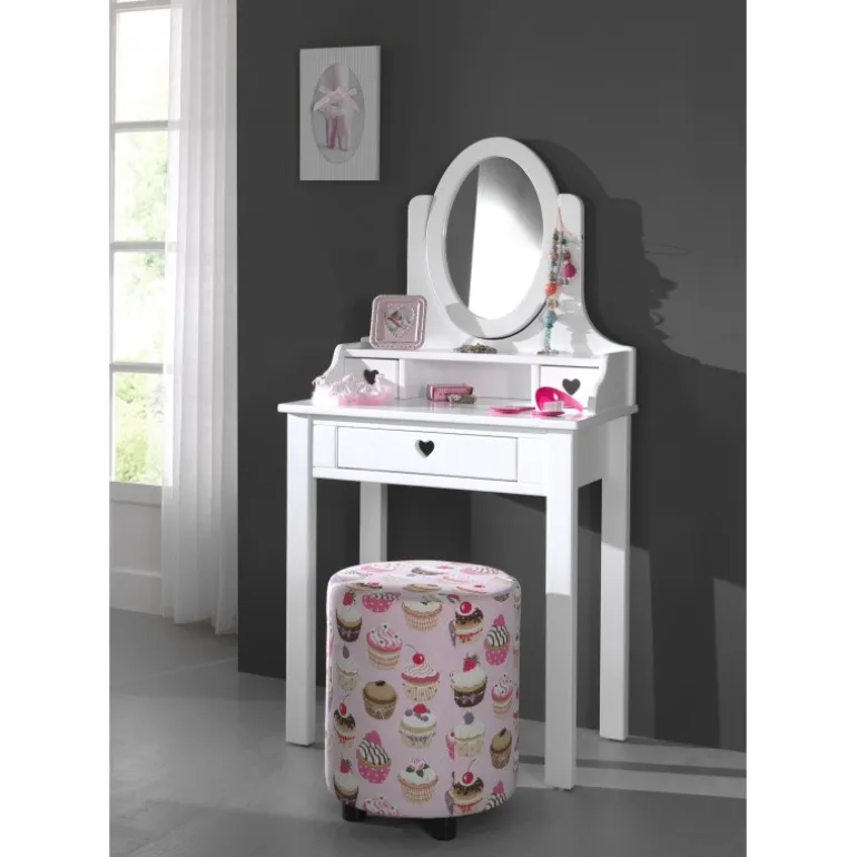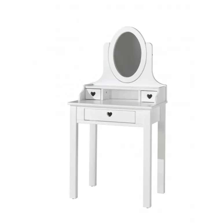 - Tidsløst hvidt makeupbord med romantiske hjerte-detaljer