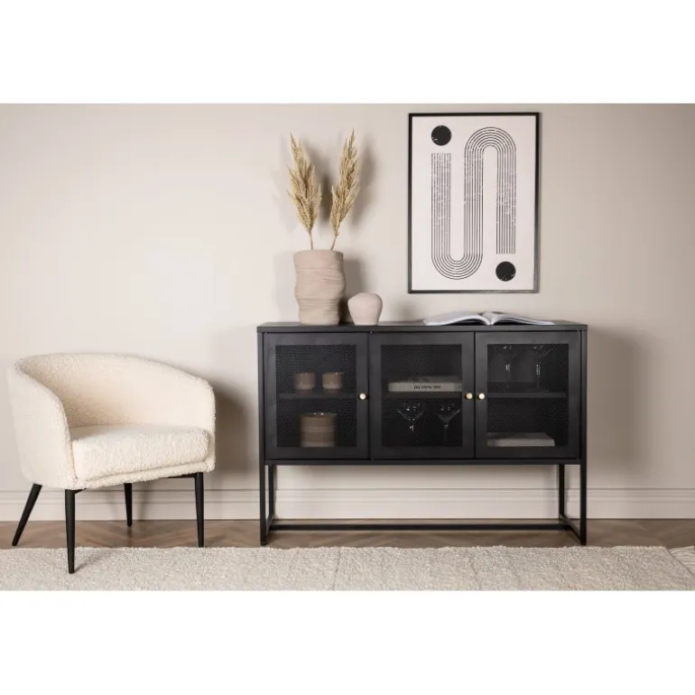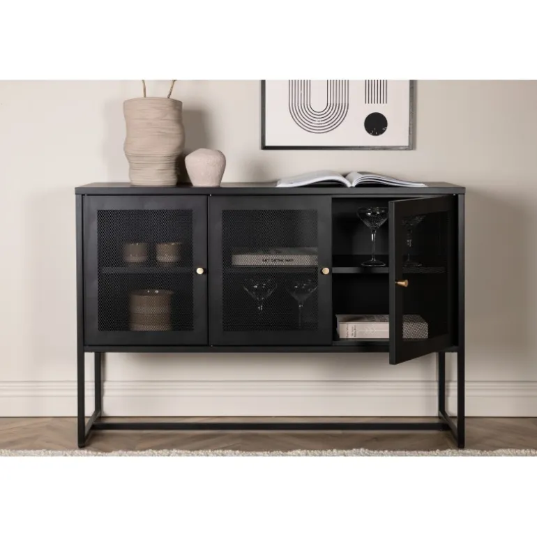 Malla – et moderne skab i et robust industrielt design med lækre mesh-døre og ben lavet af sort pulverlakeret stål med 2 smarte hylder til opbevaring. Skabet løftes af smalle, høje ben, der skaber en luftig følelse og gør det lettere at komme til med støvsugeren. Den perfekte opbevaringsmøbel til alt, hvad du ønsker – fyld det med porcelæn, bøger eller smukke dekorationer. Den fleksible størrelse og elegante udseende af skabet gør det nemt at placere og passer godt ind i de fleste rum i hjemmet, så indret efter dine egne behov og ønsker!
