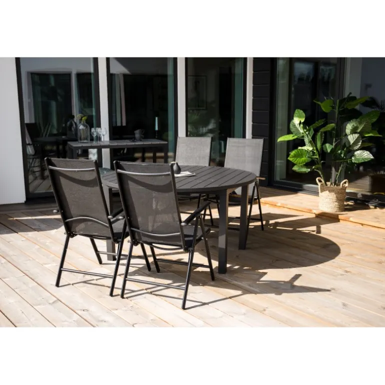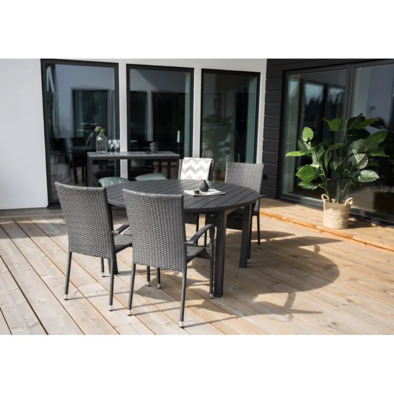 Så holdbart som det er praktisk – Marbella er et ovalt, udtrækkeligt spisebord i sort aluminium. Tilpas størrelsen til dine gæster og nyd skønne måltider udendørs denne sommer. Dets holdbare materiale og lette vægt gør bordet nemt at flytte rundt og passer lige så godt i haven som på altanen. Plejeråd: Udendørsmøbler i aluminium og rustfrit stål bør rengøres regelmæssigt med vand og mild sæbe. Skyl altid grundigt med rigeligt vand, især hvis møblerne er placeret tæt på havet, hvor salt kan transporteres gennem luften. Salt kan føre til korrosion, der kan medføre afskalning eller bobler i lakken.