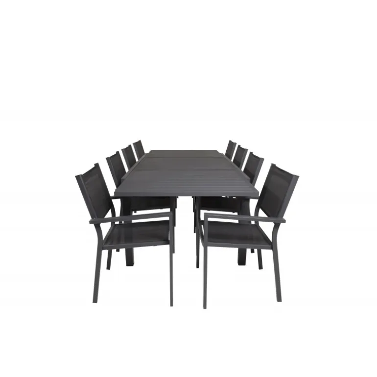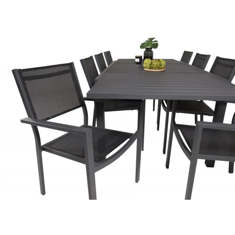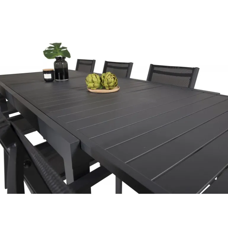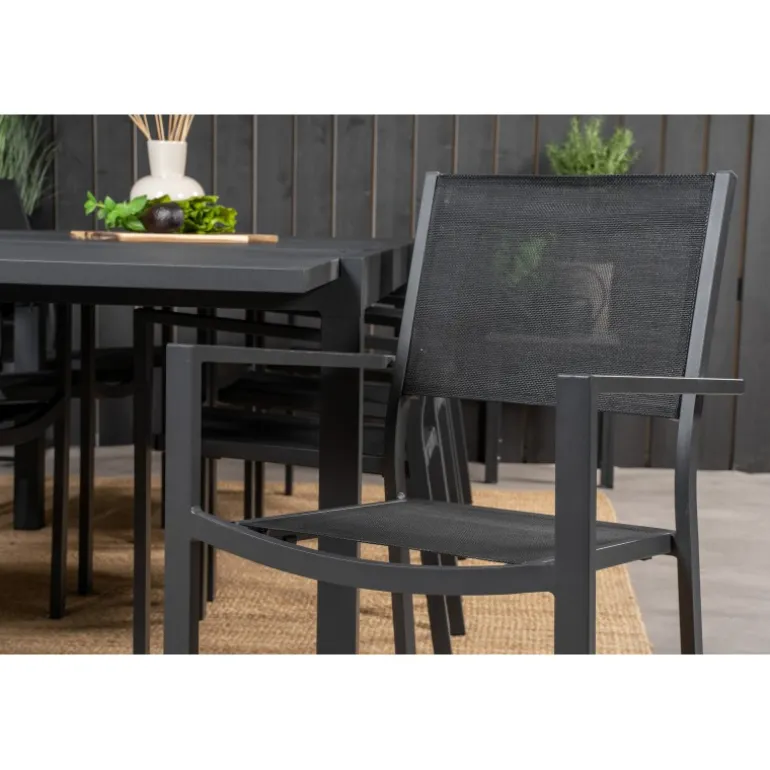 Marbella Loungesæt – Havemøbelsæt med Copacabana stole er den perfekte tilføjelse til enhver terrasse eller have. Bordet er udtrækkeligt, hvilket giver mulighed for større middagsselskaber! Dette elegante sæt i sort aluminium og textilene er både stilfuldt og holdbart. Skab uforglemmelige øjeblikke med venner og familie omkring dette smukke Loungesæt – Havemøbelsæt.
