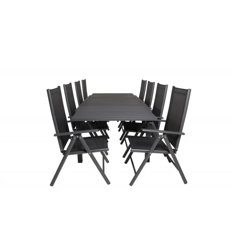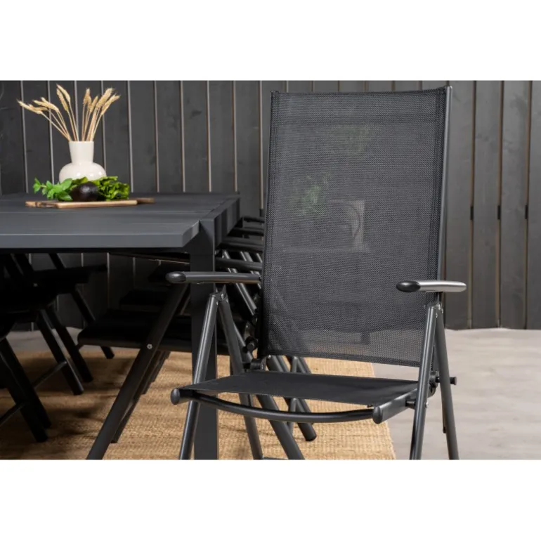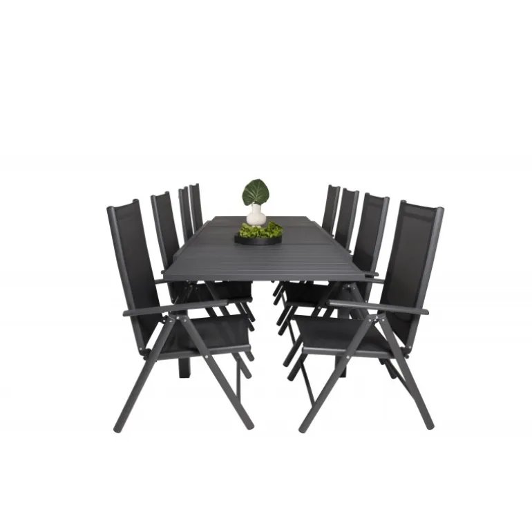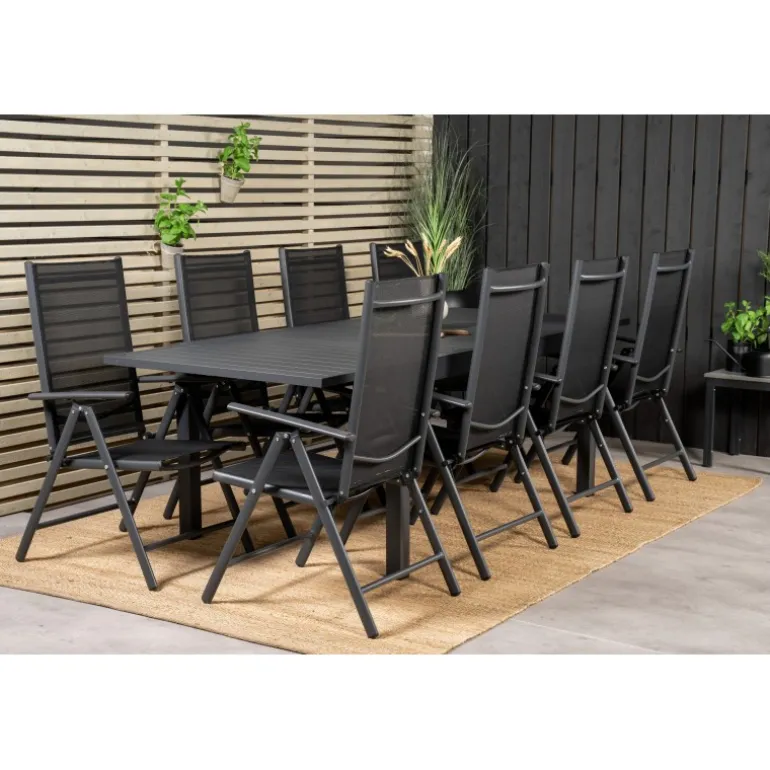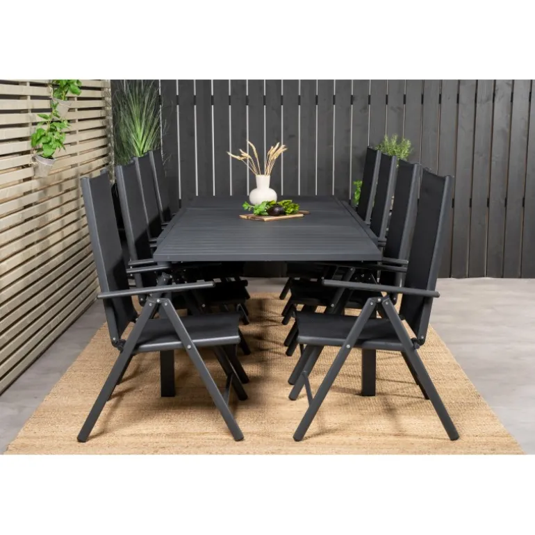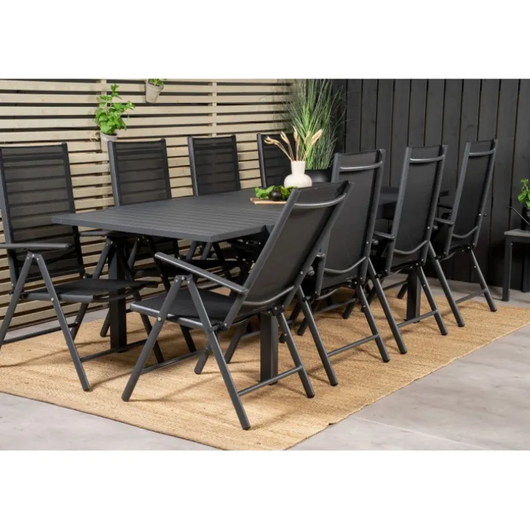 - Solidt spisebord og stole i aluminium og textilene