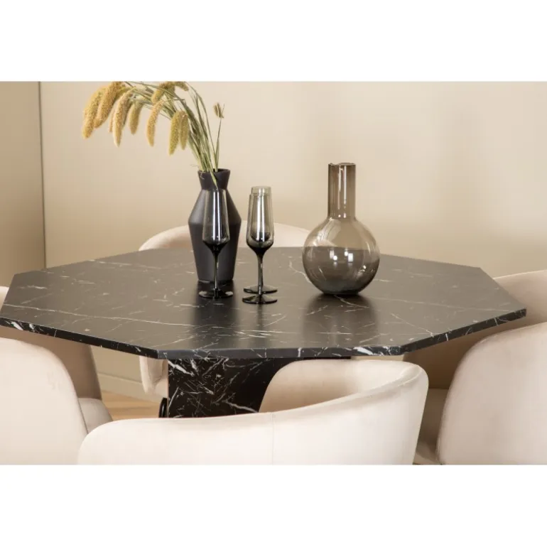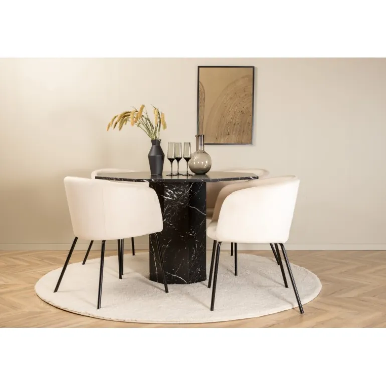 Sid komfortabelt i vores lækre spisebordsstole fra Berit-serien og nyd lange måltider sammen! Stolene har et slankt design med en indbydende sæde i beige fløjl og stoleben i sort jern. Stolens dimensioner: Højde: 78 cm, sædehøjde: 49 cm, bredde: 55 cm, dybde: 55 cm. De 4 stole matches her med vores populære spisebord Marbs. Bordet er formet som en ottekant og har et fuldt beklædt design med en bordplade i sort marmorglas med hvidt mønster og bordben i MDF og marmorpapir. Bordets dimensioner: Diameter: 110 cm, højde: 75 cm.