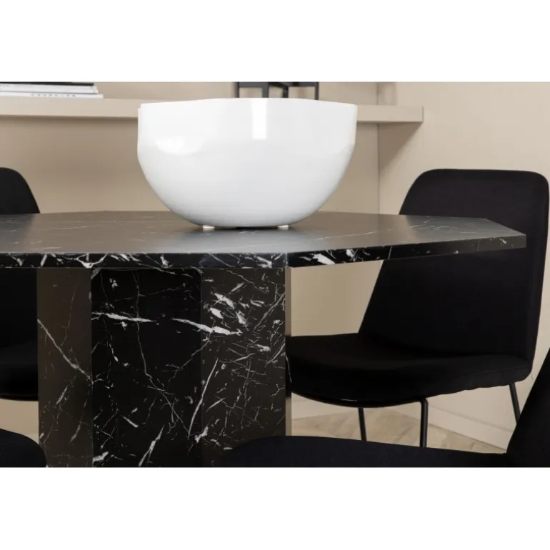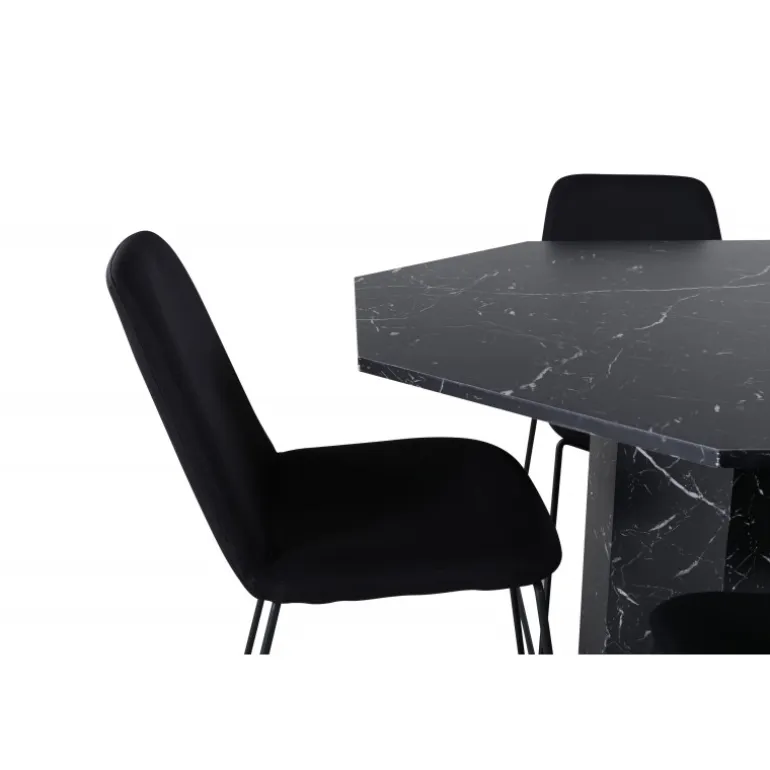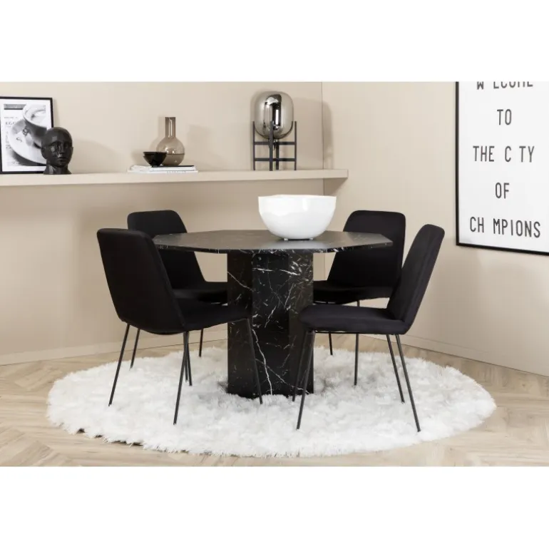 Øg niveauet af indretning med et moderne spisebordssæt i elegant design! Spisebordet Marbs er formet som en ottekant og har et fuldt beklædt design med en bordplade i sort marmorglas med plettet hvidt mønster og bordben i MDF og marmorfolie. Bordets diameter: 110 cm, højde: 75 cm. Matchet med 4 Muce spisebordsstole i stilfuldt design. Stolens ben er slanke i metal, og sæderne er i sort polyesterstof. Stolens dimensioner: højde: 84 cm, sædehøjde: 47 cm, bredde: 43 cm, dybde: 63 cm. Indret stuen med et moderne spisebordssæt, der skaber en familiær stemning!