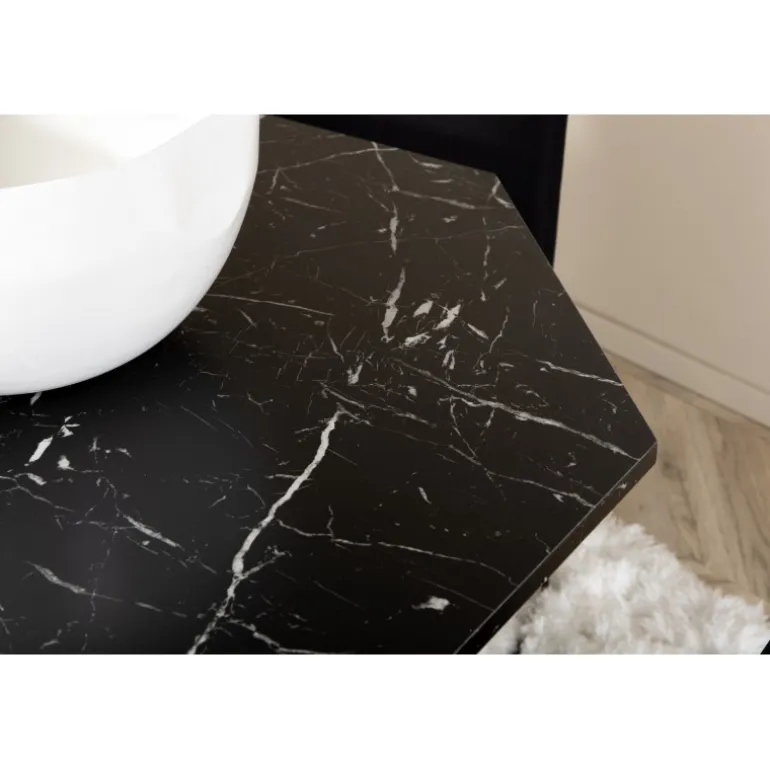 - Moderne Design: Stilfuldt ottekantet bord med sort marmorglas og hvidt mønster.