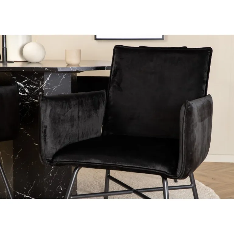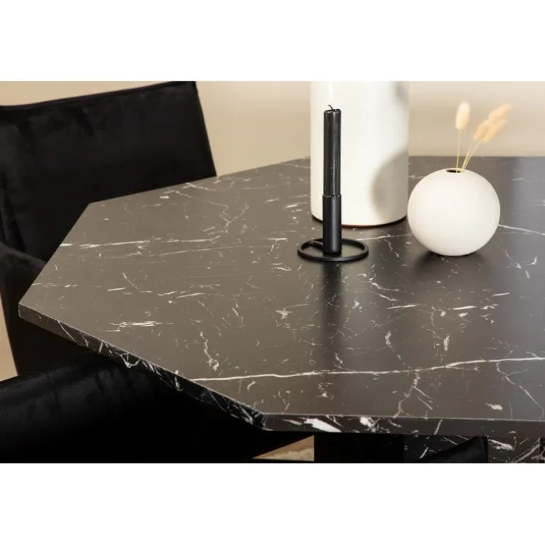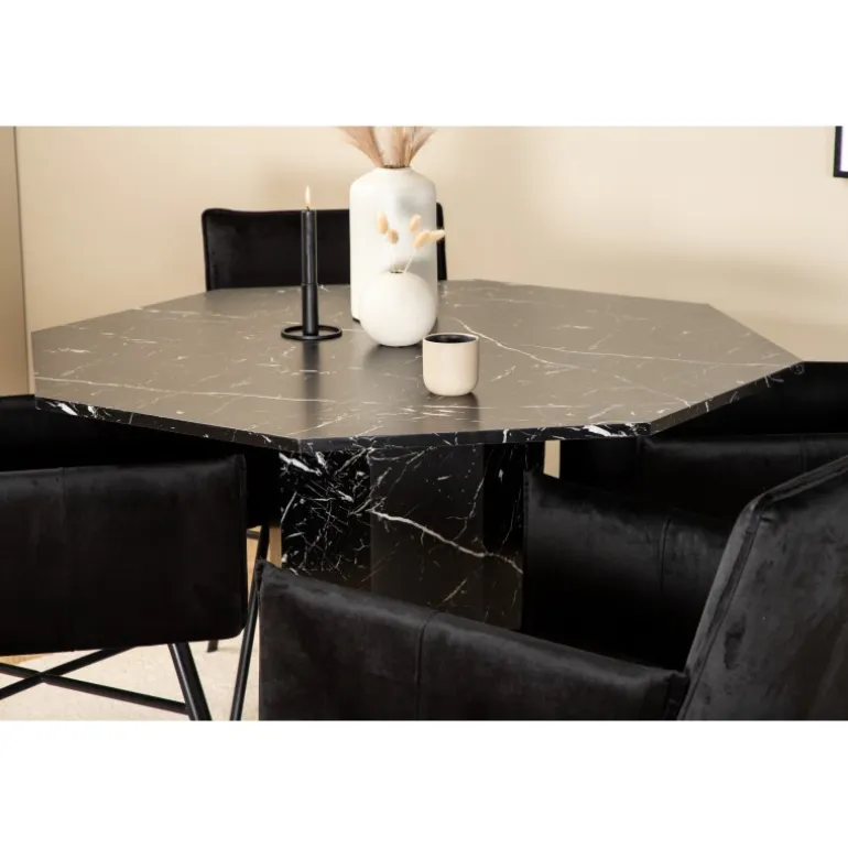 Skab et blikfang, der imponerer! Spisestolene Petra har et lækkert design med lige nordiske former, blødt velourstof i sort farve og stoleben i sort jern. Stolens dimensioner: Højde: 87 cm, sædehøjde: 48 cm, bredde: 57 cm, dybde: 60 cm. Her er de 4 stole kombineret med spisebordet Marbs – et designbord med lækkert design. Bordet er formet som en oktagon og har et fuldt beklædt design med en topplade i sort marmorglas med spættet hvidt mønster og bordben i MDF og marmor papir. Bordets dimensioner: Diameter: 110 cm, højde: 75 cm.