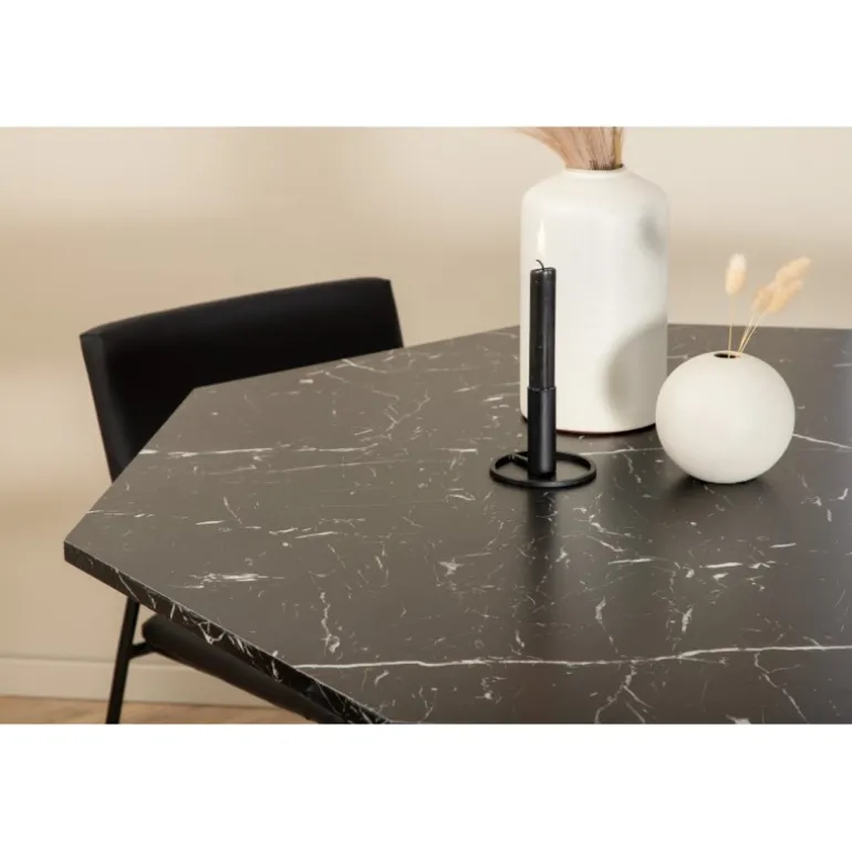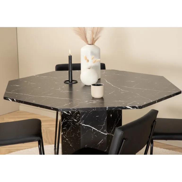 Inviterende og stilfuldt – Marbs Rundt Spisebordssæt skaber et modebevidst indtryk i dit hjem! Bordet er formet som en ottekant og har et fuldt beklædt design med en topplade i sort marmorglas med hvidt stænkmønster og bordben i MDF og marmorpapir. Bordets diameter: 110 cm, højde: 75 cm. Matcher her med 4 Kenth spisebordsstole i sort farve med stoleben i jern og sæder i kunstlæder. Stolens dimensioner: Højde: 76 cm, sædehøjde: 48,5 cm, bredde: 40 cm, dybde: 52 cm. Lad hjemmets hjerte pryde af denne iøjnefaldende Spisebordssæt!