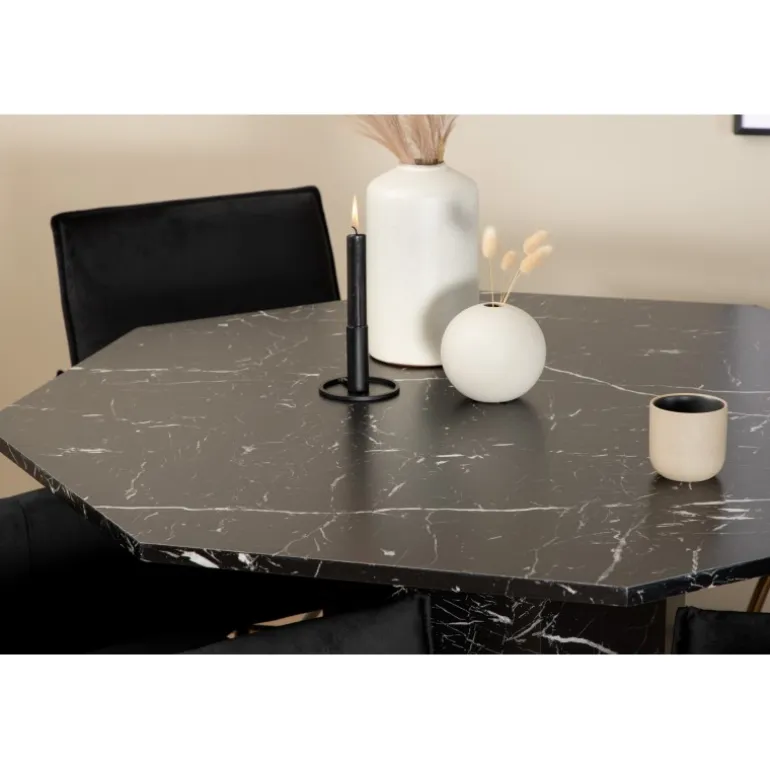 - Unikt borddesign: Ottekantet bord med sort marmorglasplade og hvidt mønster.