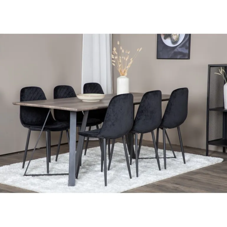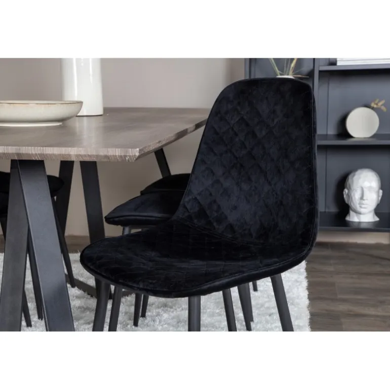 Vores elegante sorte fløjlsstole i Polar-serien. Her i en stilfuld kombination med vores populære spisebord Marina. Perfekt kombination til hjemmets hjerte, som sandsynligvis vil passe lige så godt til dine behov som til din øvrige indretning. Lavet af MDF, krydsfiner og stål, garanterer dette Spisebordssæt både holdbarhed og et moderne udtryk.