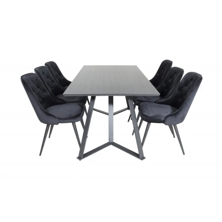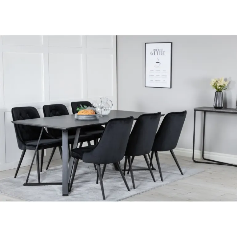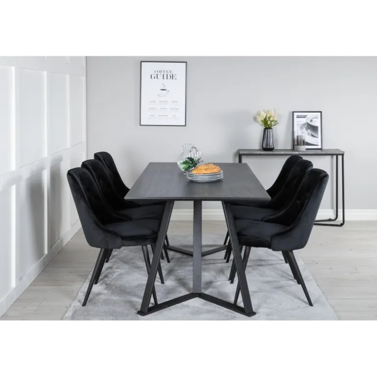 At købe en færdigsammensat Spisebordssæt er både trendsikkert og praktisk! Her kombinerer vi vores spisebord Marina med vores luksuriøse spisebordsstole Velvet. Lad hjertet i hjemmet blive præget af din nye iøjnefaldende Spisebordssæt. Sort farve og materialer af MDF, krydsfiner og stål sikrer holdbarhed og stil.