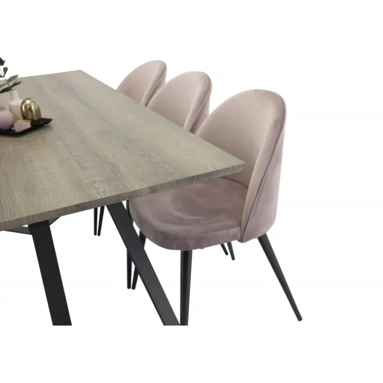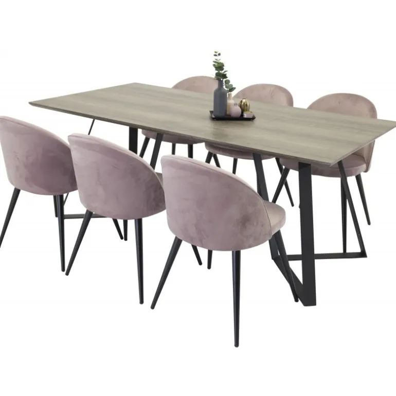 Marina moderne og stilfulde Spisebordssæt – her sammen med spisebordsstole fra serien Velvet. Skab noget elegant og socialt med plads til god mad og hyggelige stunder! Dette sæt inkluderer en rektangulær spisebord i naturfarvet MDF med stålben og komfortable stole i støvet pink. Perfekt til både hverdagsmåltider og festlige lejligheder. Nem at samle og passer ind i ethvert hjem.