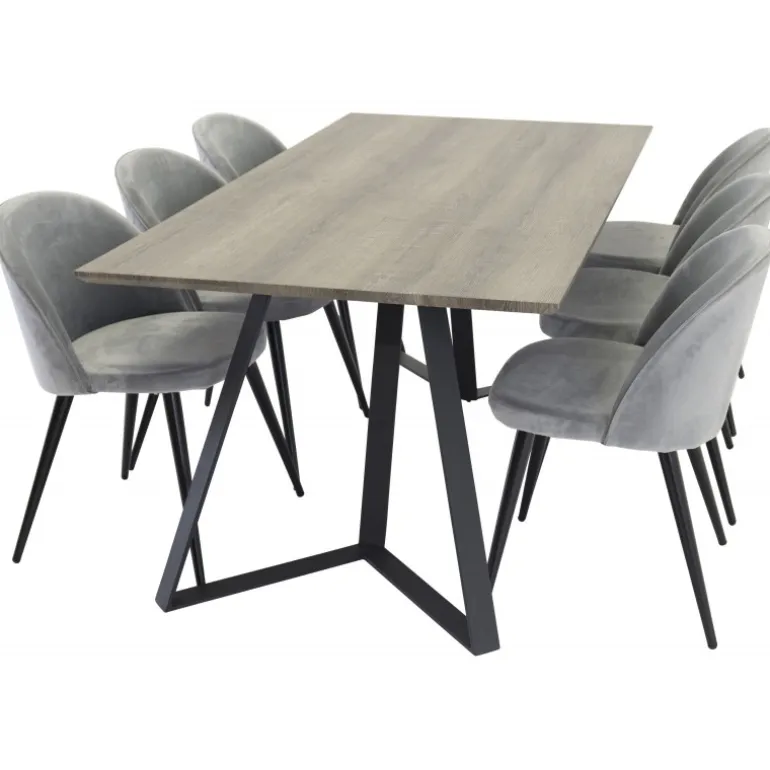 Spisebordet Marina i en dejlig træfinish kombineret med bløde, lysegrå fløjlstole fra serien Velvet. Et rustikt og hyggeligt valg, der passer ind i de fleste hjem! Dette sæt tilbyder både stil og komfort, hvilket gør det perfekt til familiemiddage eller sociale sammenkomster. Marina Rektangulært Spisebordssæt er designet til at bringe en varm og indbydende atmosfære til dit spisestue.