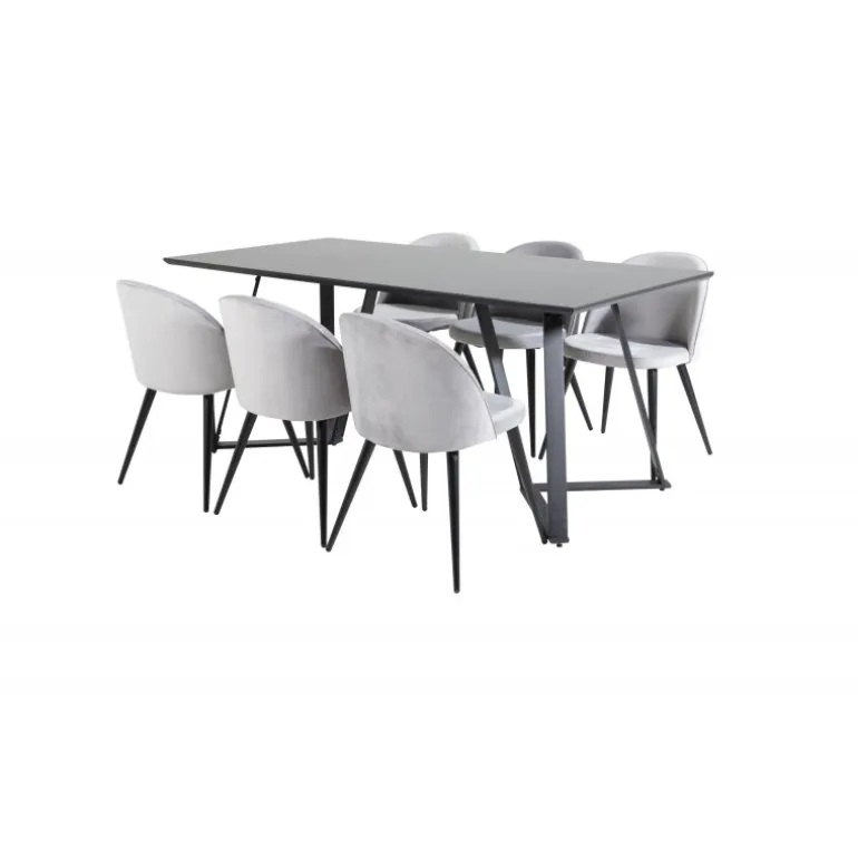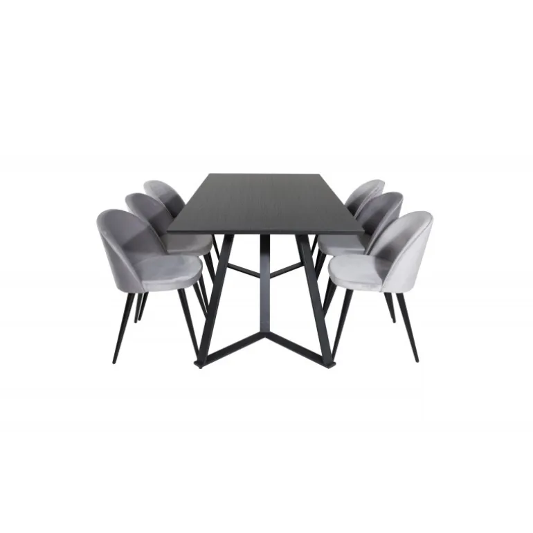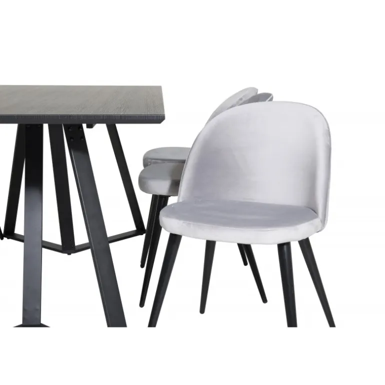 Køb af et færdigsammensat Spisebordssæt er både trendsikkert og praktisk! Her kombinerer vi vores spisebord Marina med vores luksuriøse spisestole Velvet. Lad hjertet af dit hjem blive præget af dit nye iøjnefaldende Spisebordssæt. Det elegante sorte bord i MDF og grå stole i bøjtræ og stål skaber en stilfuld kontrast, der passer til ethvert interiør.