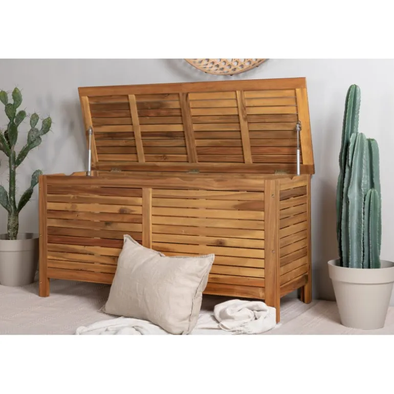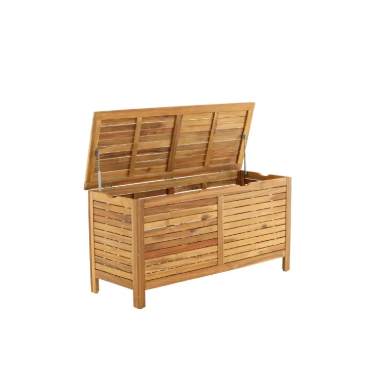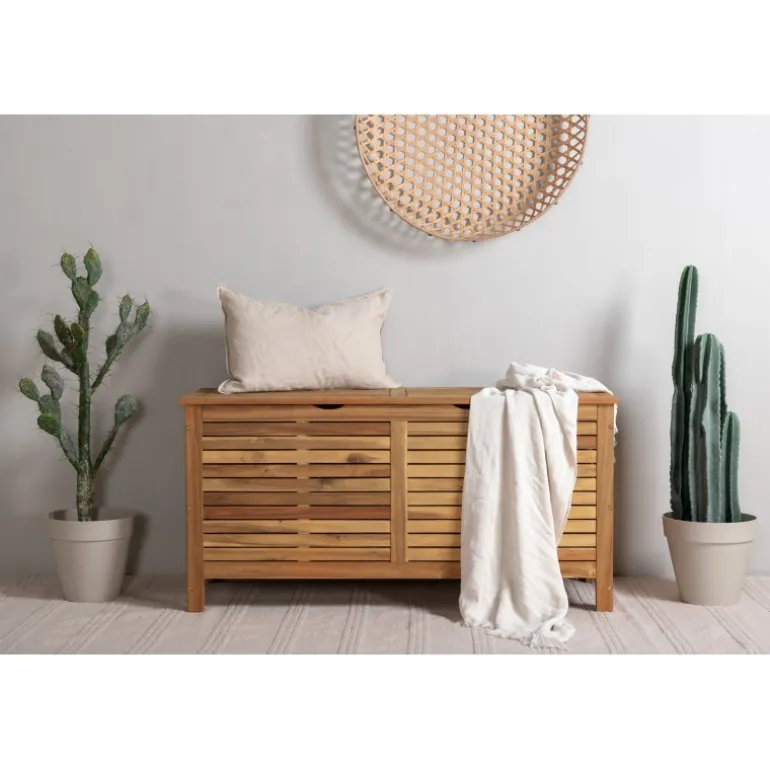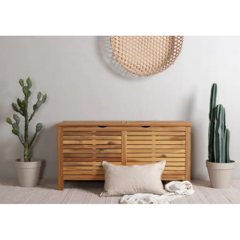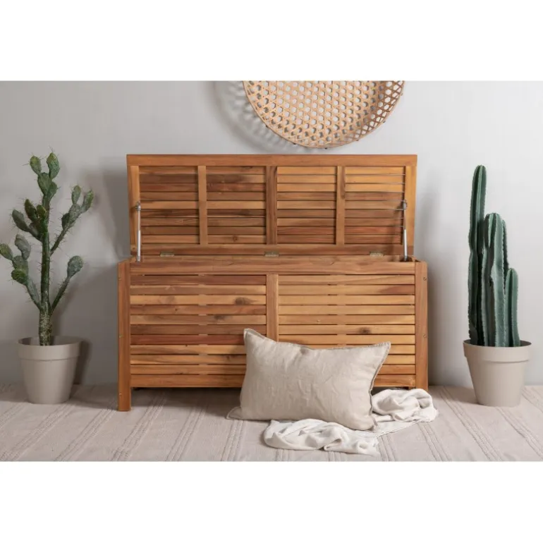 Hvem elsker ikke at kombinere opbevaring med tidløst design? Med Marion Hyndeboks i akacietræ vil du kunne opbevare dine hynder i en stilfuld løsning, der holder over tid. En interiørdekoration, der bidrager med varme og giver en indbydende følelse! For at dine udendørsmøbler i akacie/hårdttræ kan bevare deres finish, bør de behandles med olie. Træet er ikke naturligt fedtet, så det skal olieres lidt nu og da, selv i løbet af sæsonen. Nyindkøbte møbler skal mættes med olie, påfør flere lag i træk, så træet maksimerer sin olieoptagelse. Tør overskydende olie af. Sørg for at behandle møblerne inden sæsonstart og et par gange i løbet af sæsonen.