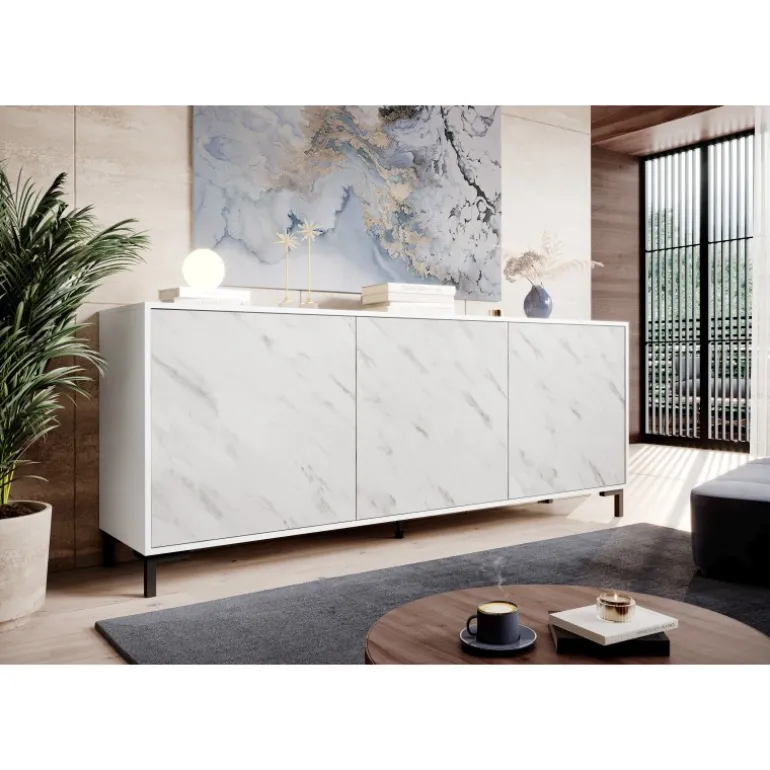 Oplev den elegante MARMO KOM 200/3D hvid kommode, der forener stil og funktionalitet. Med dimensionerne Højde: 80,5 cm, Bredde: 200 cm, Dybde: 45 cm, passer denne kommode perfekt ind i ethvert rum. Lavet af lamineret spånplade med en marmorimitation, udstråler den luksus og holdbarhed. Kommodens ABS-kanter og plastikben sikrer langvarig brug, mens PUSH-CLICK håndtagssystemet gør åbning og lukning nem og praktisk.
