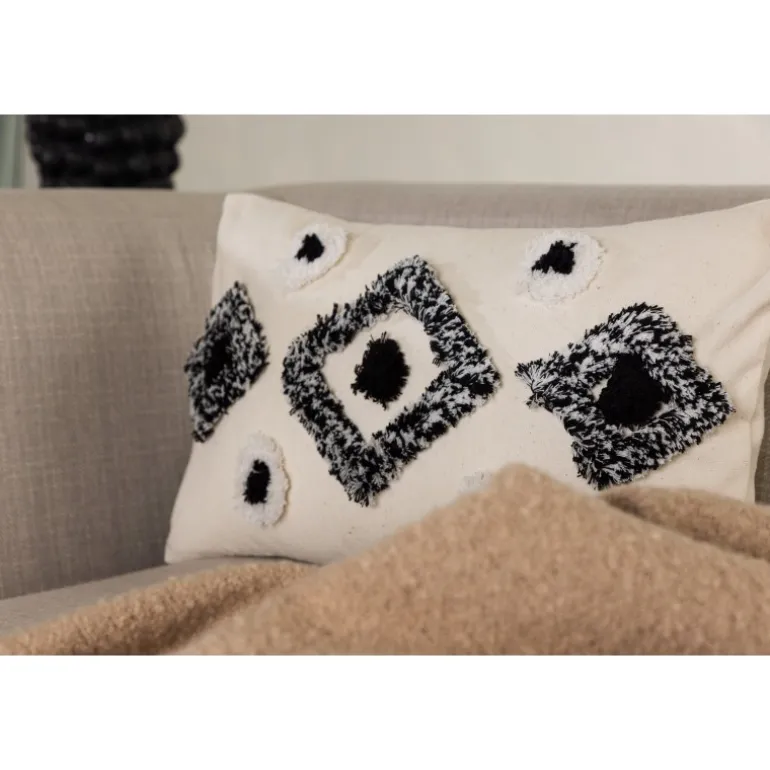 Melissa, vores populære pudebetræk, der kombinerer komfort med moderne design! Dette aflange pudebetræk har en hvid basefarve og et abstrakt mønster i tuftet materiale i både hvid og sort farve. Fremstillet af en perfekt blanding af polyester og bomuld, som er både fleksibel og holdbar. Skab et flot blikfang i sofagruppen med et trend-sikkert pudebetræk, der nemt kan matches og kombineres med andre pudebetræk!