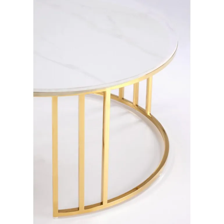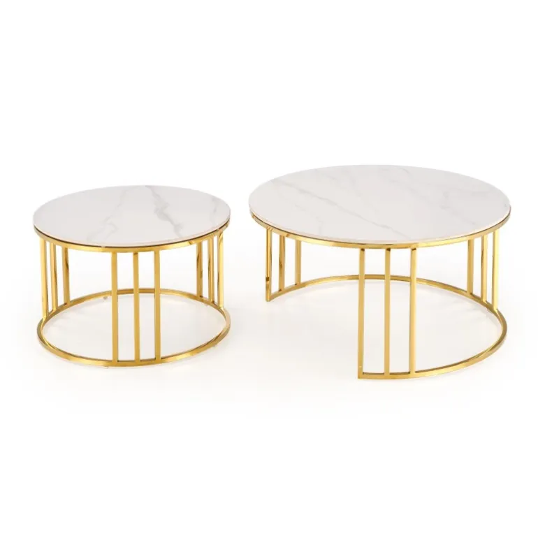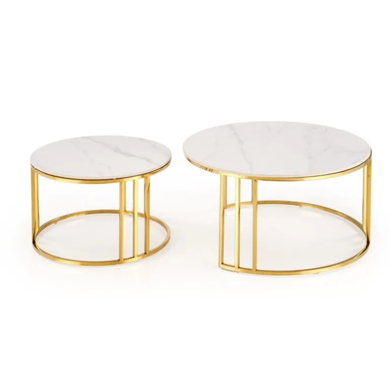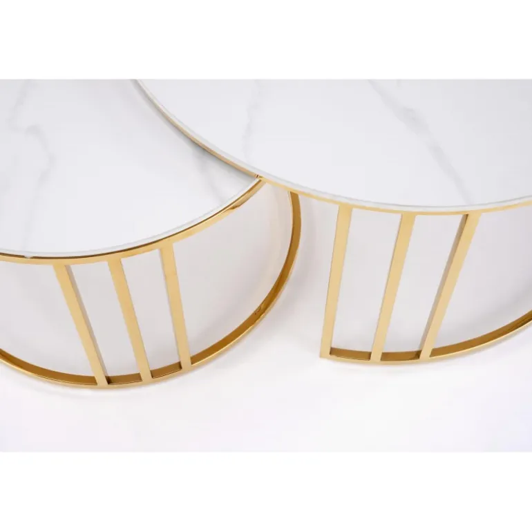 Oplev elegance og funktionalitet med MERCURY 3 sæt af 2 sofaborde i hvid marmor og guld. Disse borde er fremstillet af sinteret sten og rustfrit stål, hvilket sikrer både holdbarhed og stil. Med dimensionerne 80/42 cm og 60/38 cm passer de perfekt ind i enhver moderne stue. Det smukke hvid marmor look kombineret med det gyldne stel giver en luksuriøs følelse til dit hjem. Køb dette sæt og tilføj et strejf af sofistikeret stil til dit interiør.