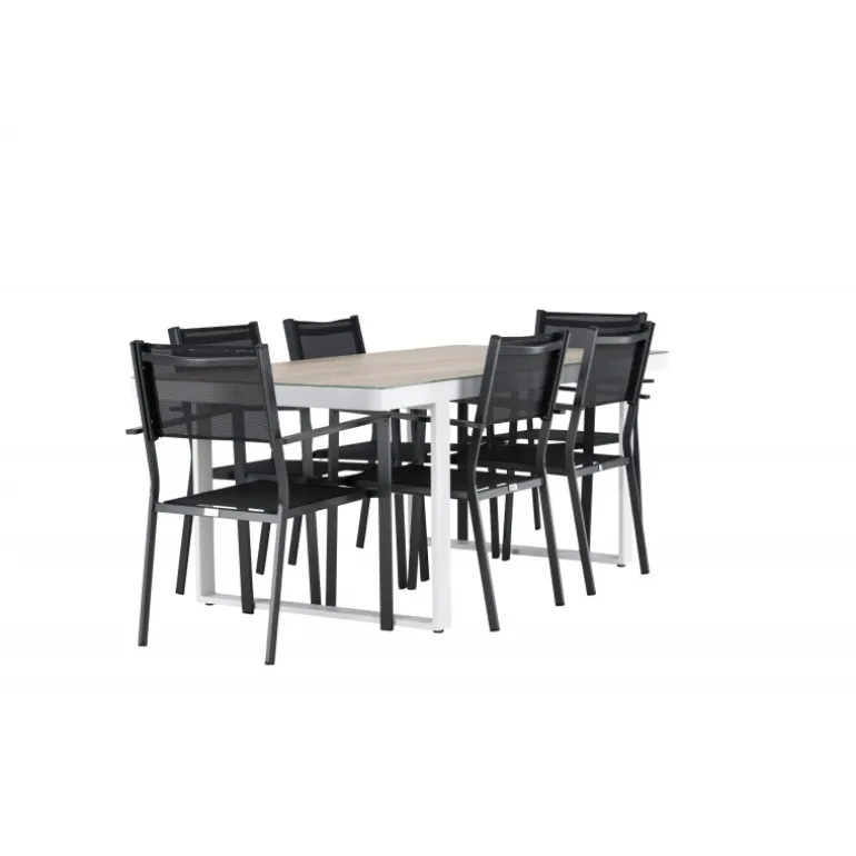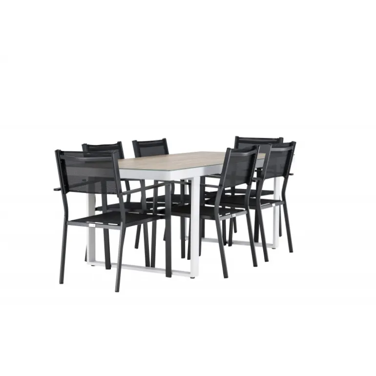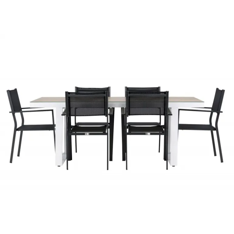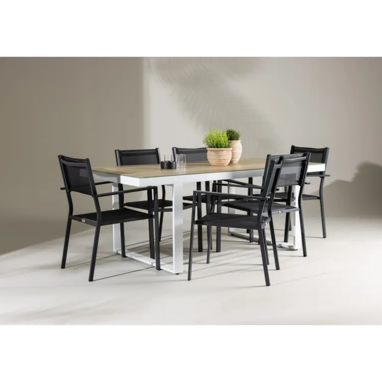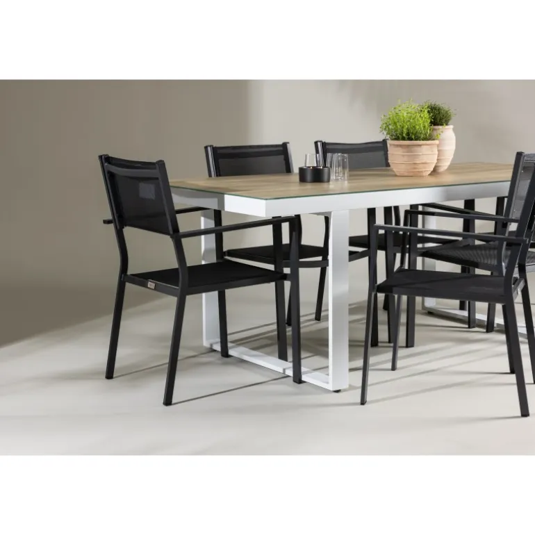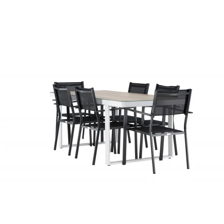 Opdag det perfekte Loungesæt – Havemøbelsæt til dit udendørsområde med vores elegante Merlo bord og stilfulde Copacabana stole. Med sit moderne udseende og praktiske design er dette sæt en fremragende tilføjelse til din terrasse eller have. Merlo bordet er lavet af aluminium og er toppet med en elegant glasplade, hvilket tilføjer et sofistikeret touch til dit udendørsmiljø. Dets hvide farve giver en følelse af friskhed og luksus til dit udendørs spiseområde. Copacabana stolene er også lavet af aluminium og har en dyb sort farve, der bringer en kontrastfyldt og moderne æstetik til dit udendørsområde. Deres elegante design og komfortable sæder gør dem perfekte til afslappede måltider eller sociale sammenkomster udendørs. Dette Loungesæt – Havemøbelsæt leveres komplet med seks komfortable stole, hvilket gør det ideelt til store familiemiddage eller festlige sammenkomster under åben himmel. Med Merlo og Copacabana Loungesæt – Havemøbelsættet kan du skabe et indbydende og stilfuldt udendørsmiljø, hvor du og dine gæster kan nyde dejlige øjeblikke fuldt ud.