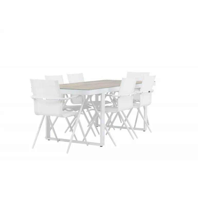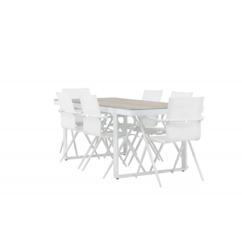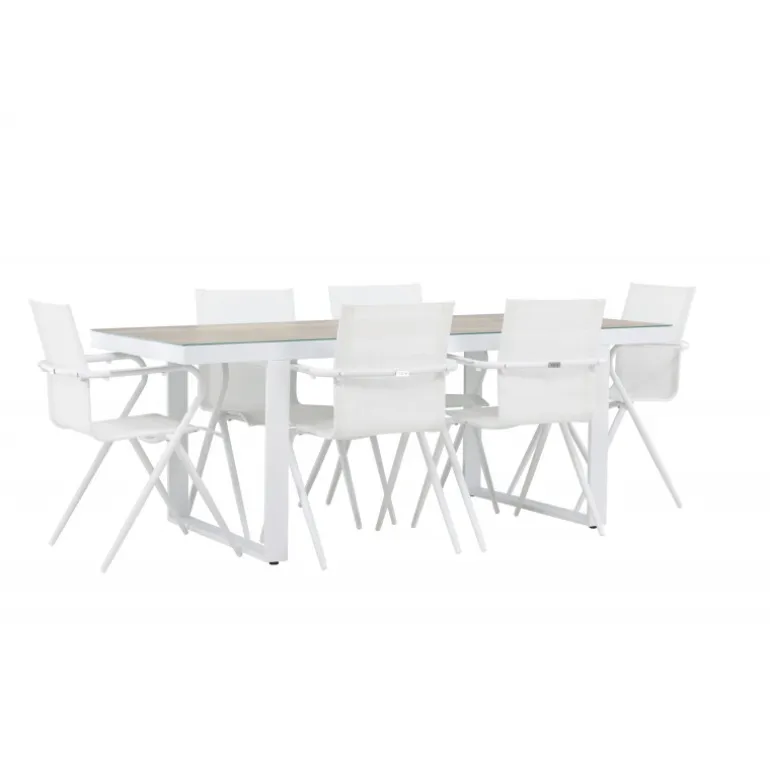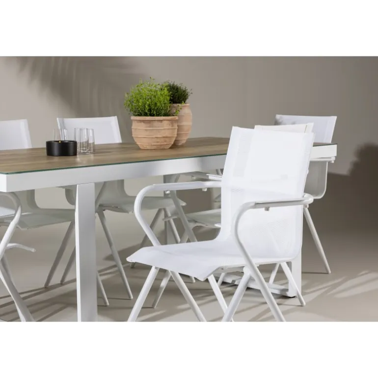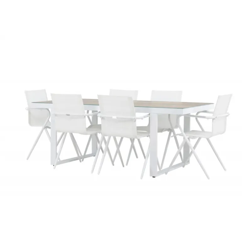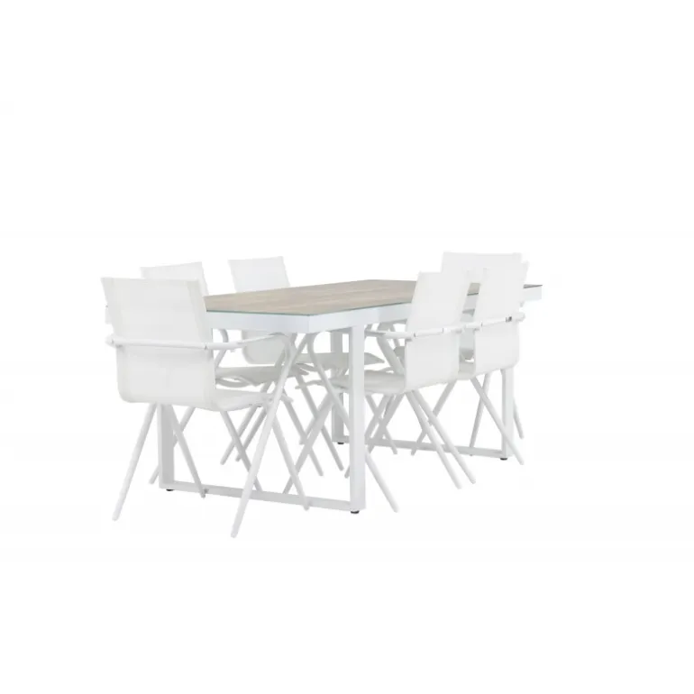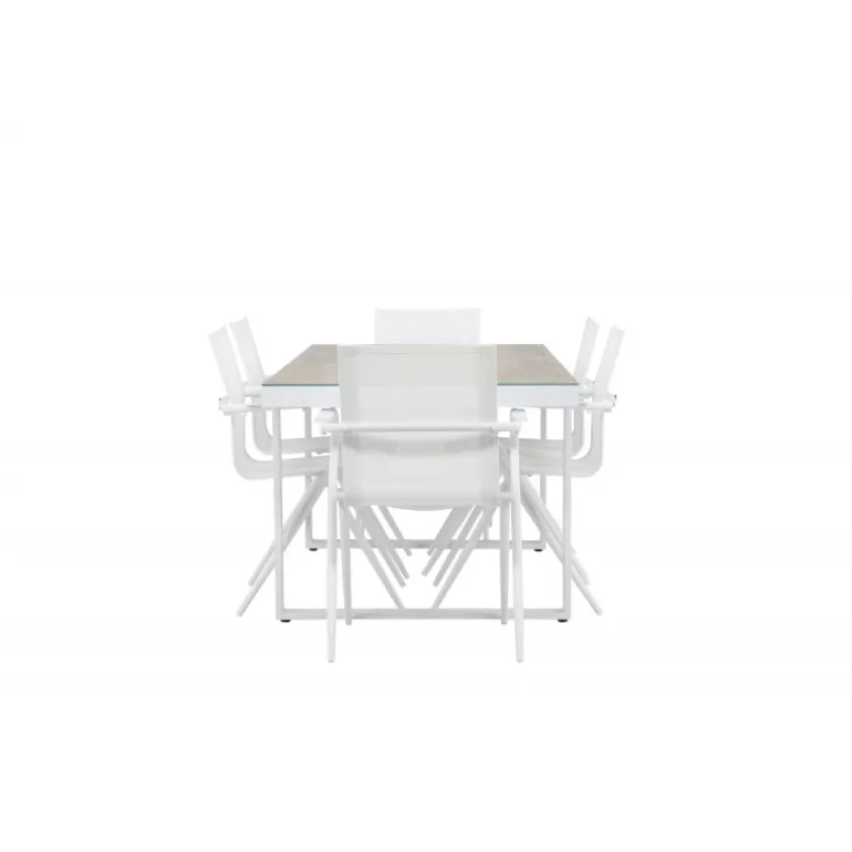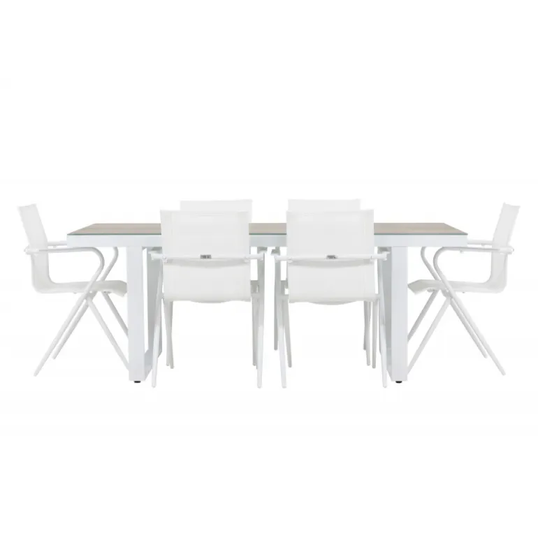 Oplev den perfekte harmoni mellem moderne elegance og tidløs enkelhed med vores Loungesæt – Havemøbelsæt, komplet med seks Alina stole og det elegante Merlo bord. Dette imponerende ensemble er ideelt til at skabe en indbydende atmosfære til sammenkomster med venner og familie. Alina stolene, med deres elegante hvide farve og komfortable textilene-materiale, tilbyder ikke kun stil, men også en varm følelse af komfort. Aluminiumsrammen giver stabilitet, samtidig med at den opretholder et tidløst design. Merlo bordet, med sine generøse dimensioner på 200×75 cm og hvide aluminiumsmateriale, skaber et imponerende midtpunkt for enhver udendørs spiseoplevelse. Dets neutrale farve og elegante design gør det til et slående fokuspunkt i din have eller på din terrasse. Uanset om det er en afslappet sammenkomst eller en festlig middag, vil Alina og Merlo Loungesæt – Havemøbelsættet forbedre dit udendørs område med sin imponerende tilstedeværelse og elegance. Skab mindeværdige øjeblikke sammen og nyd den indbydende atmosfære, som dette Loungesæt – Havemøbelsæt tilbyder.