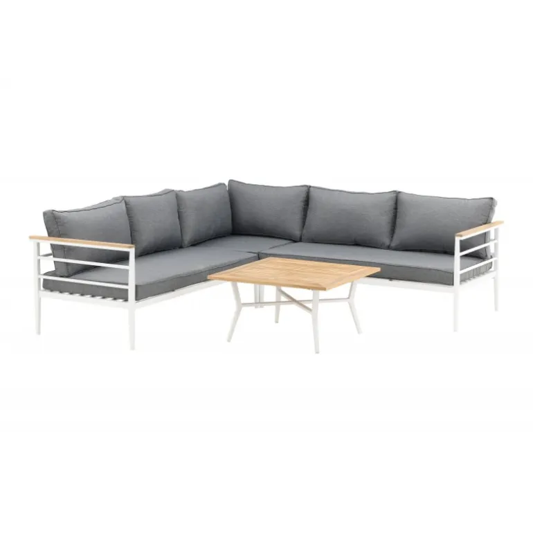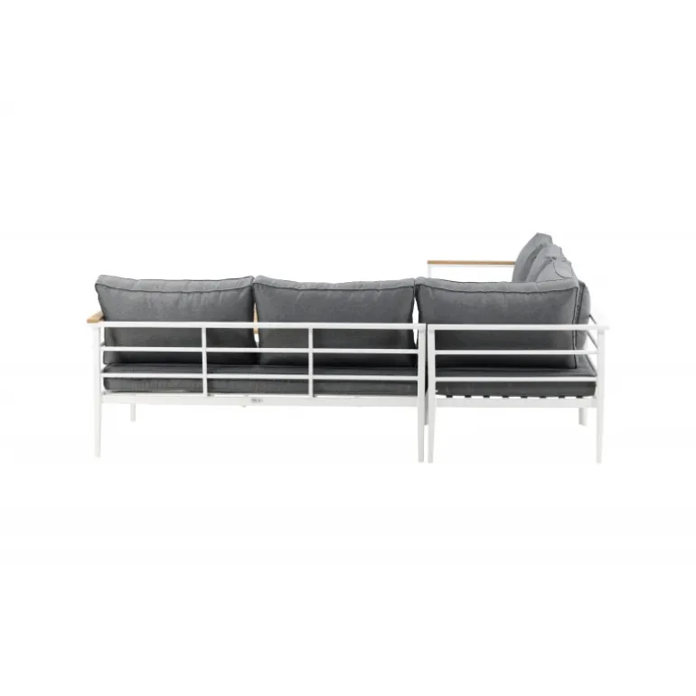 - Materialer af høj kvalitet: Hvid pulverlakeret metalramme med teakdetaljer og bløde grå puder.