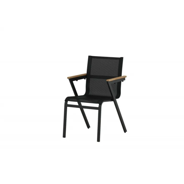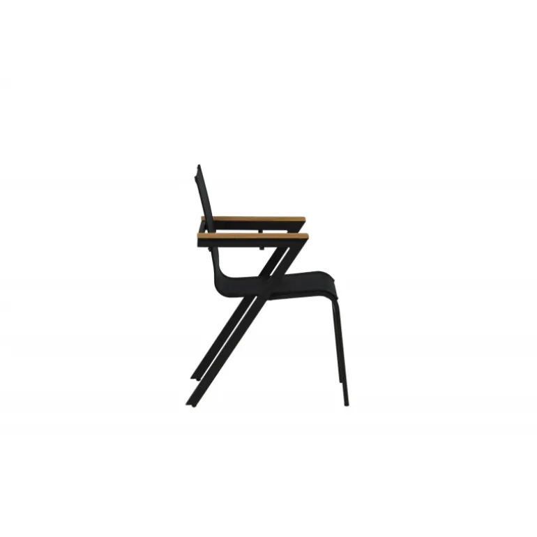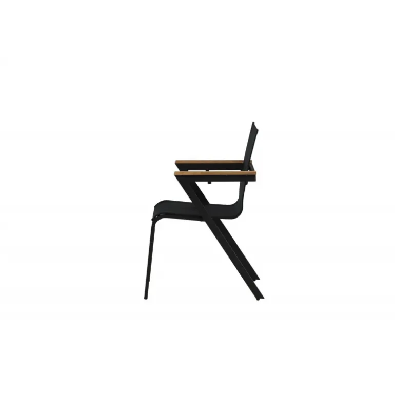 Gør dig klar til sommerens nætter med en tidløs armstol fra Mexico-serien. En sort, smagfuld spisestol, der passer perfekt til både moderne og klassiske spiseborde. Armlænene er lavet af teak, hvilket skaber en flot detalje til det sorte sæde. Stolen er stabelbar, hvilket gør den nem at opbevare. Sid komfortabelt og nyd dejlige måltider udendørs! Plejeråd: Vores møbler i tekstil er normalt kombineret med teak eller aluminium. Textilene er et syntetisk stof lavet af PVC-behandlet polyester. Materialet er vandafvisende og UV-behandlet for at modvirke solens blegning.