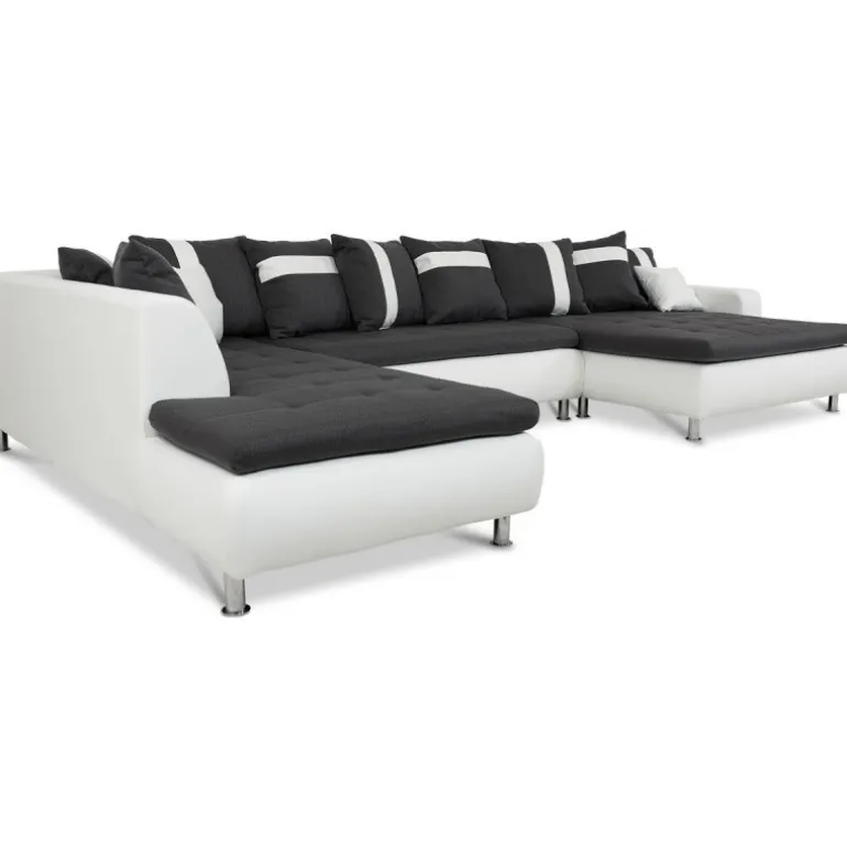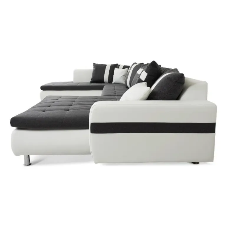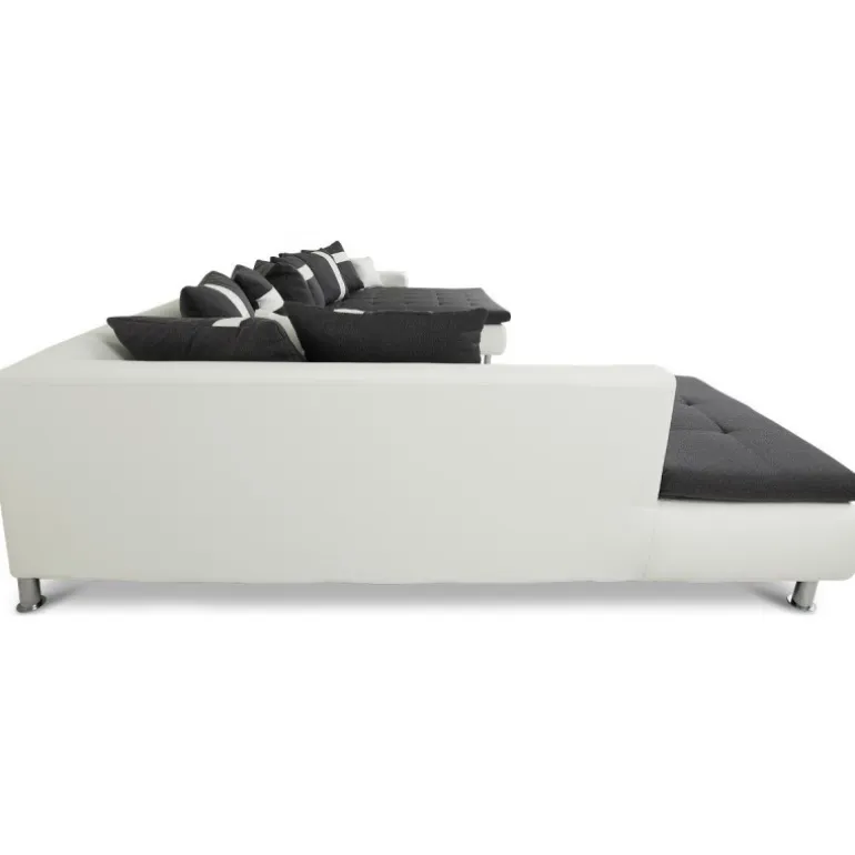 Miami U-sofa med venstrevendt chaiselong betrukket med stof på sæder og hvidt tekstillæder. En sofa i moderne og ekstraordinært design, som skiller sig ud fra mængden af ensartede sofaer. En kæmpe flyder sofa med ekstraordinært meget siddeplads samt god komfort. Sofaen har en blød koksgrå siddehynde med flotte kvadrat syninger, og kommer med 8 store og 2 små puder. Med denne stilfulde sofa sikrer du siddeplads til hele familien.