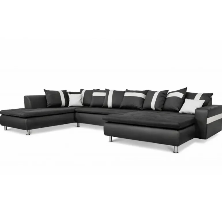 Miami U-sofa med venstrevendt chaiselong betrukket med stof på sæder og hvidt/sort tekstillæder. En sofa i moderne og ekstraordinært design, som skiller sig ud fra mængden af ensartede sofaer. En kæmpe flyder sofa med ekstraordinært meget siddeplads samt god komfort. Sofaen har en blød koksgrå siddehynde med flotte kvadrat syninger, og kommer med 8 store og 2 små puder. Med denne stilfulde sofa sikrer du siddeplads til hele familien.