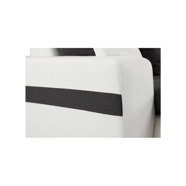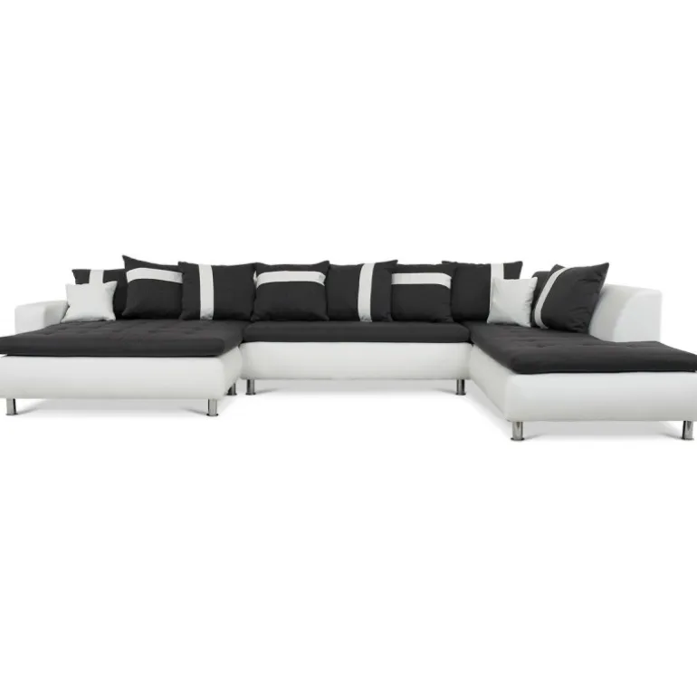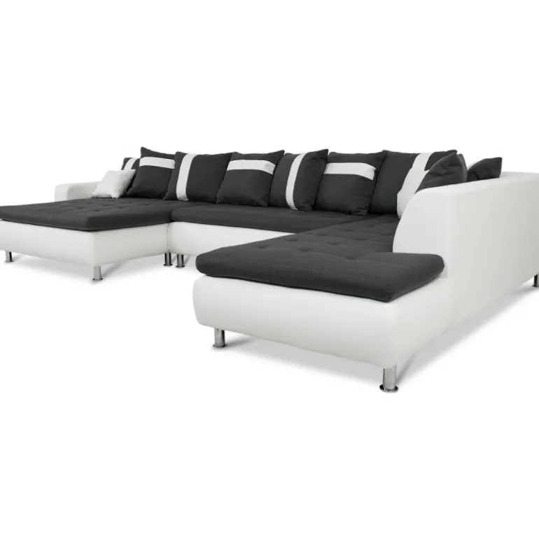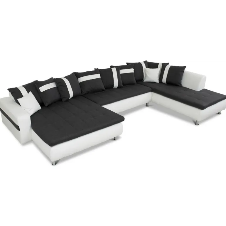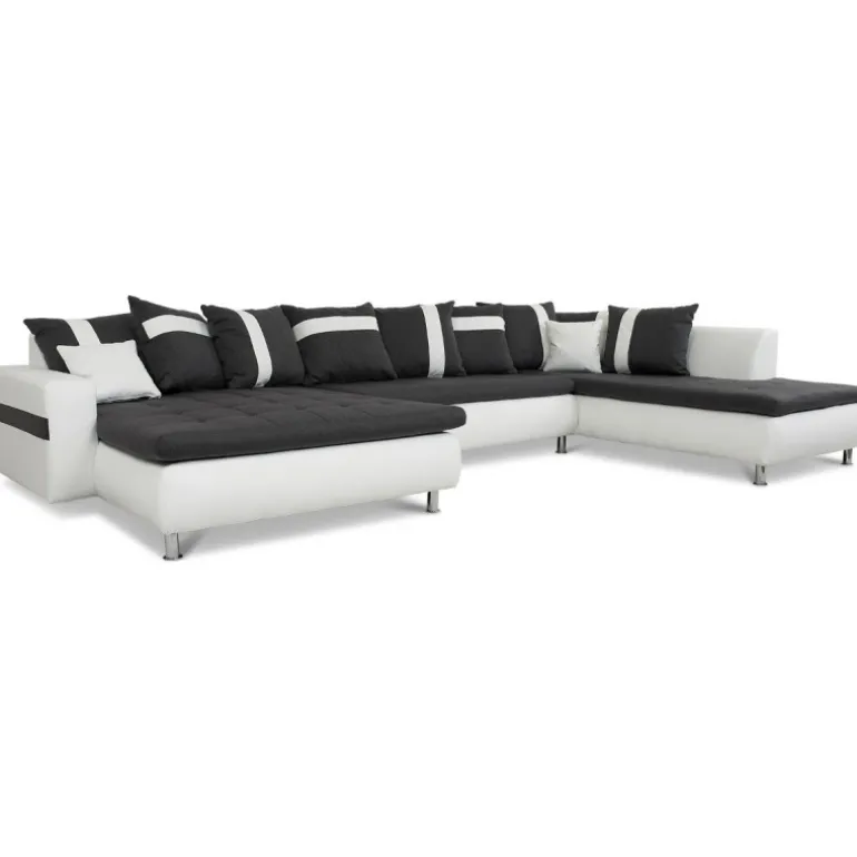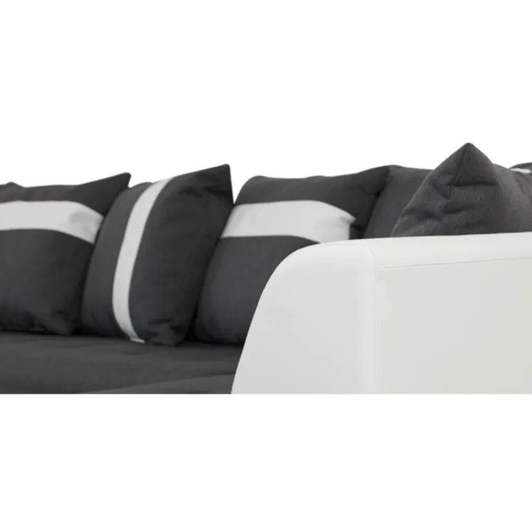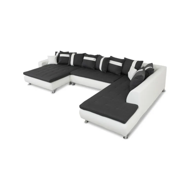 Miami U-sofa med venstrevendt chaiselong betrukket med stof på sæder og hvidt tekstillæder. En sofa i moderne og ekstraordinært design, som skiller sig ud fra mængden af ensartede sofaer. En kæmpe flyder sofa med ekstraordinært meget siddeplads samt god komfort. Sofaen har en blød koksgrå siddehynde med flotte kvadrat syninger, og kommer med 8 store og 2 små puder. Med denne stilfulde sofa sikrer du siddeplads til hele familien.